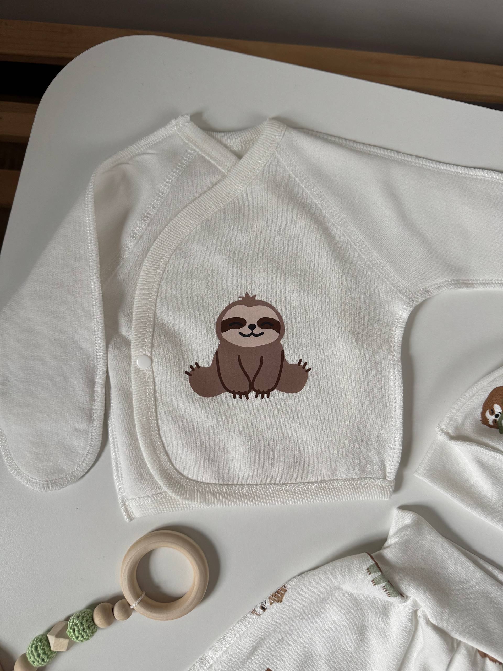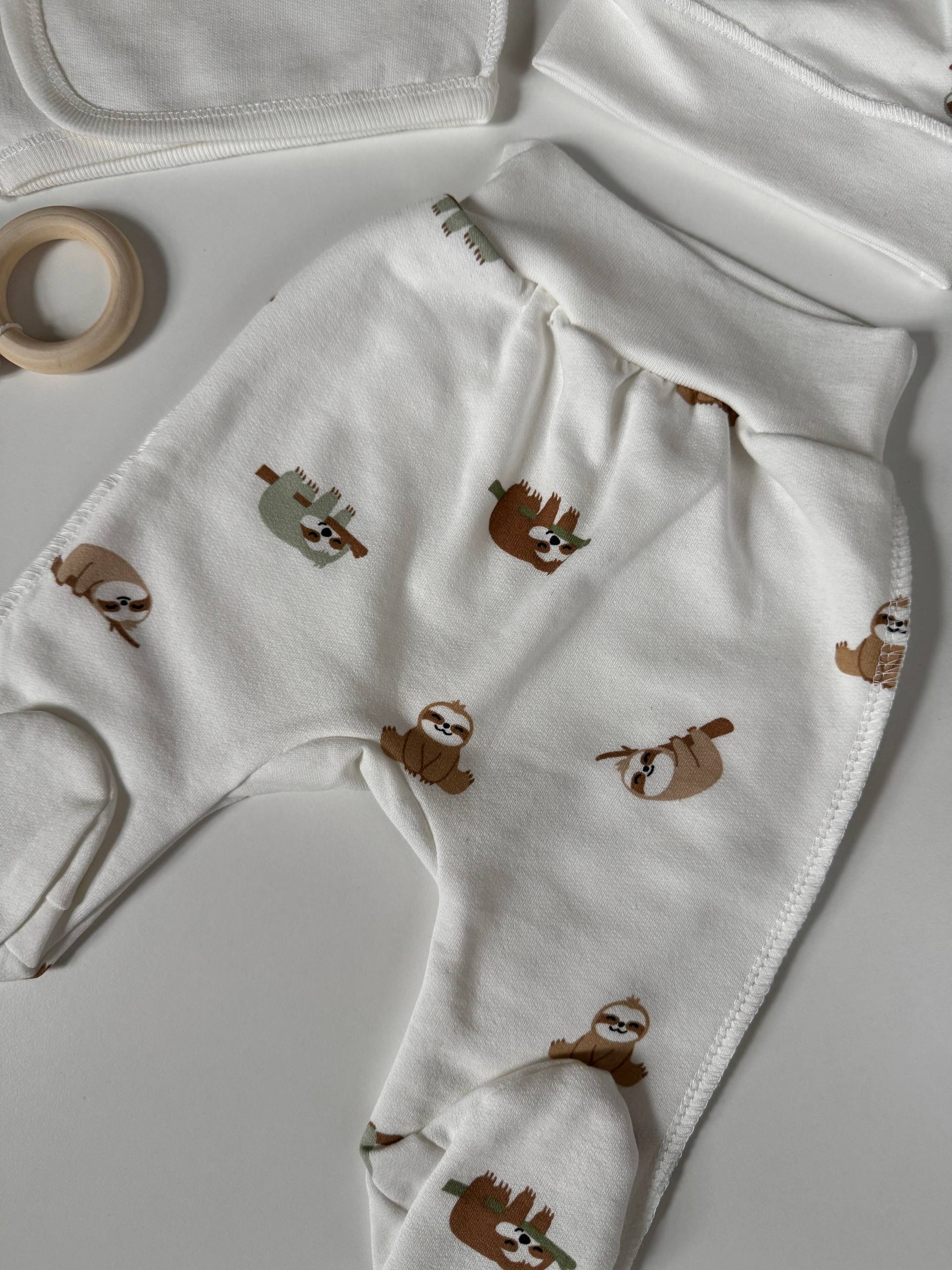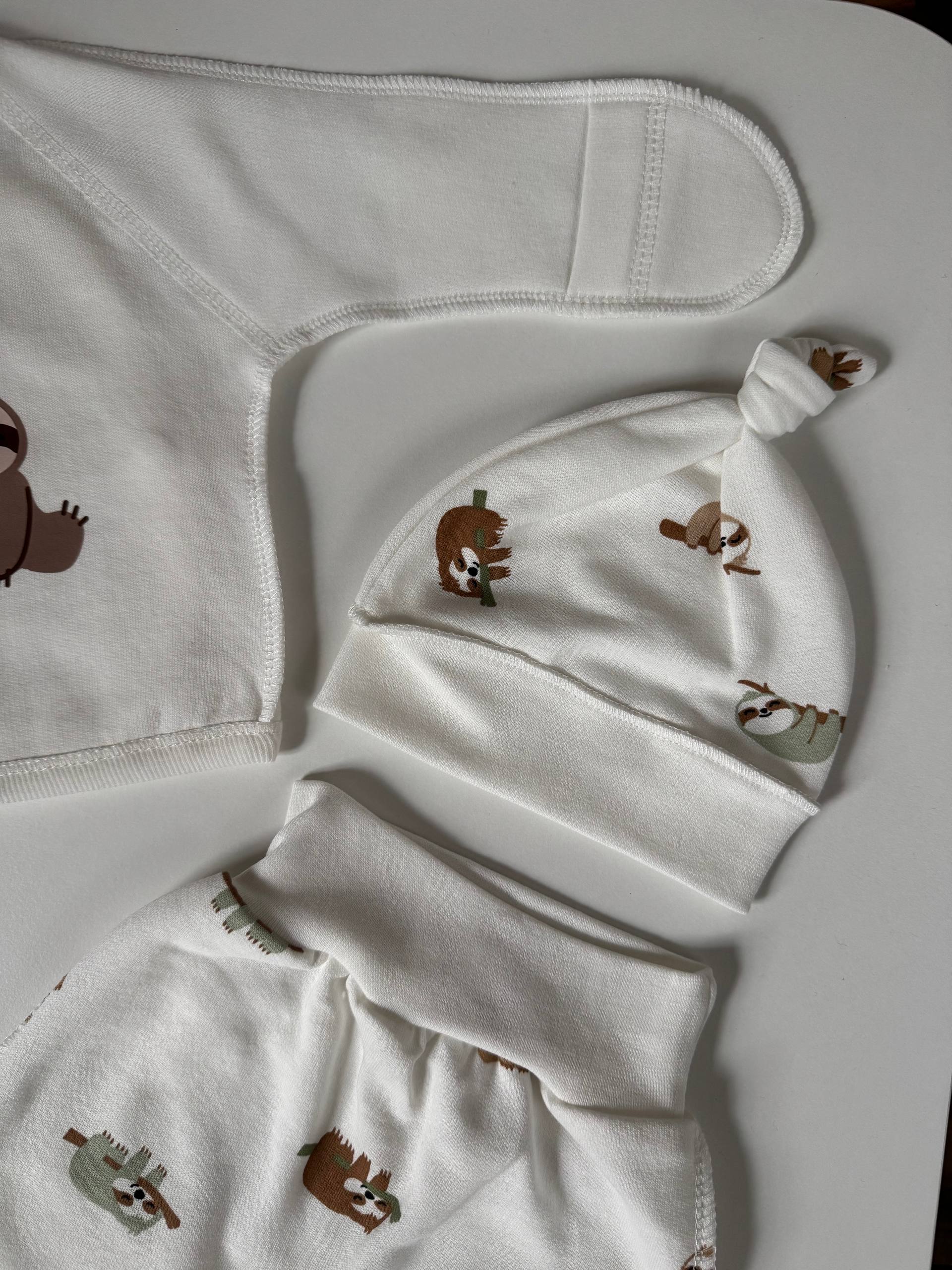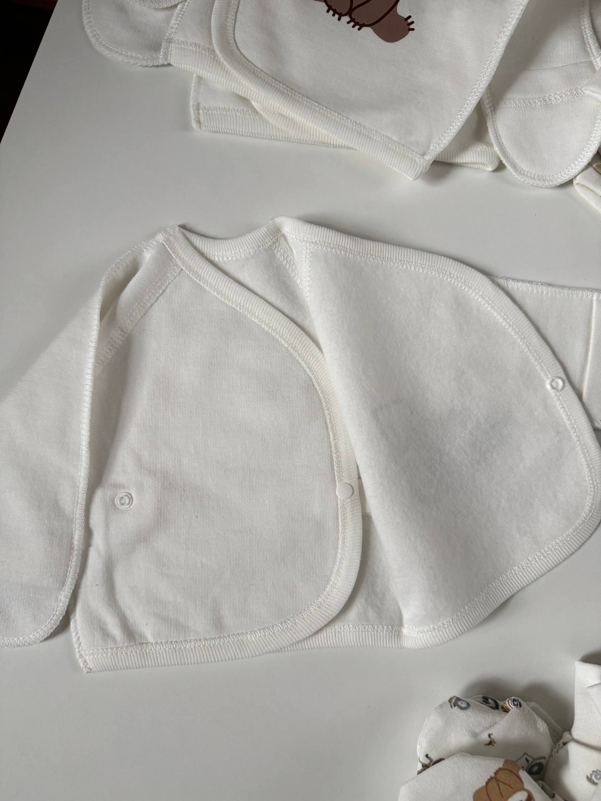 М’який та затишний комплект із трьох одиниць, виконаний з ніжного футеру для максимального комфорту немовляти. Натуральна бавовна з легким начісом всередині ідеально підтримує природне тепло тіла та дозволяє шкірі дихати. Набір включає зручну сорочечку з кнопками для швидкого переодягання, повзуни з м'якою резинкою та милу шапочку з вузликом. Сорочка доповнена манжетами-антицарапками, які дбайливо ховають ручки, а правильний крій кожної речі не обмежує рухи малюка. Це ідеальний вибір для виписки або створення першої капсули в пологовий будинок. Розмір: 56 (0-1 місяць).