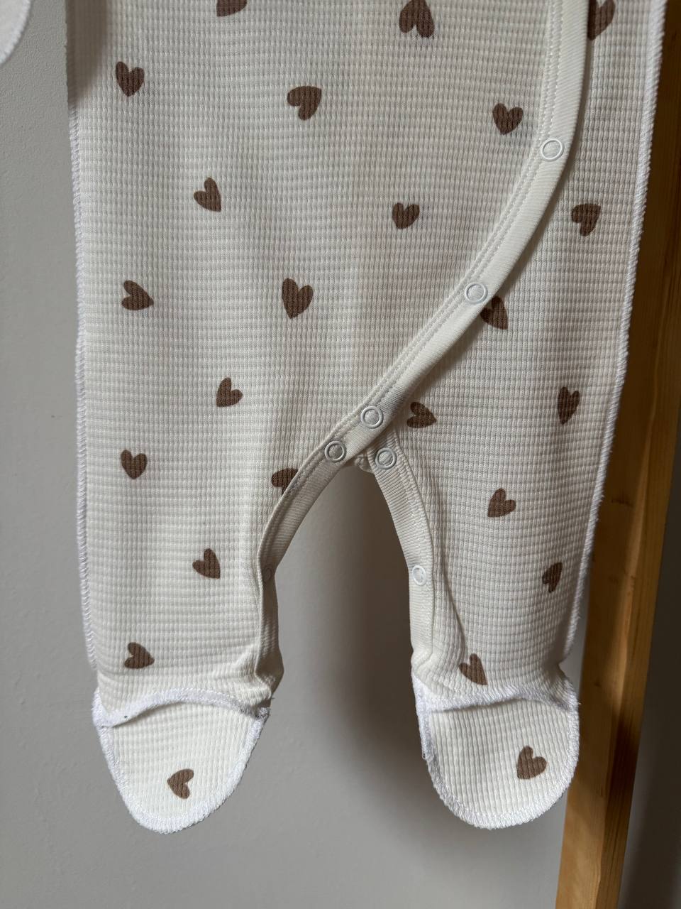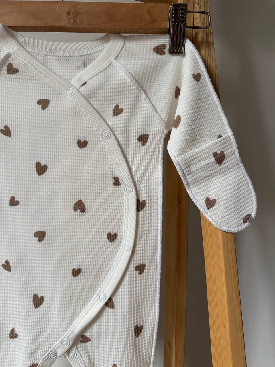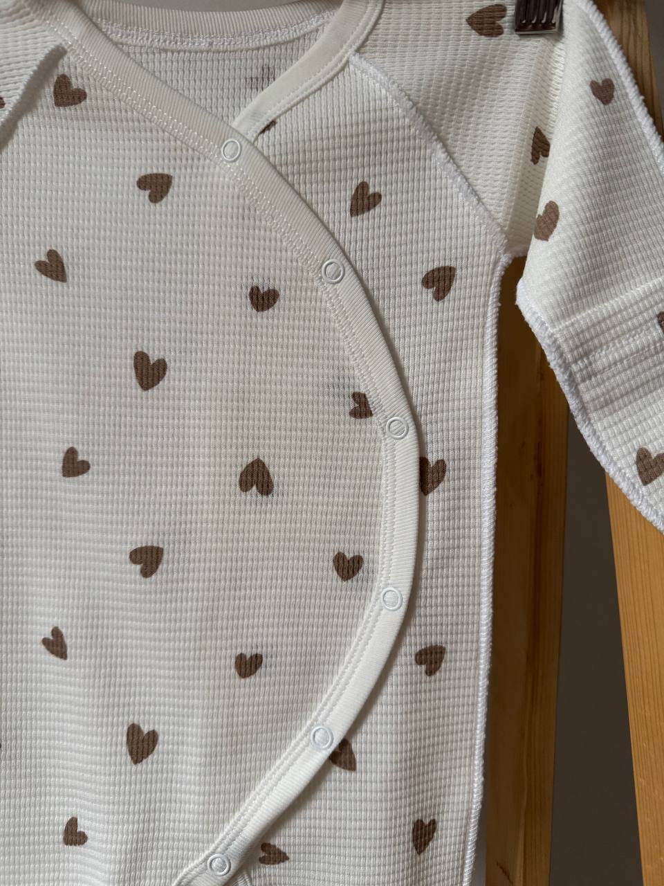 Ніжний та неймовірно стильний чоловічок, виконаний з натуральної вафельної тканини для особливого затишку вашого малюка. Об'ємна фактура бавовняного полотна не лише виглядає естетично, а й чудово пропускає повітря, забезпечуючи ідеальну терморегуляцію та комфорт у будь-яку пору року. Зручні кнопки по всій довжині роблять переодягання та зміну підгузка швидкими й легкими, не турбуючи немовля. Модель має закриті ніжки, спеціальні манжети-антицарапки для захисту ручок та правильний анатомічний крій, що дарує повну свободу першим рухам. Це гармонійне поєднання сучасного дизайну та природної м'якості, яке ідеально підійде для першої фотосесії, виписки або стильних домашніх буднів. Розмір: 56 (0-1 місяць).