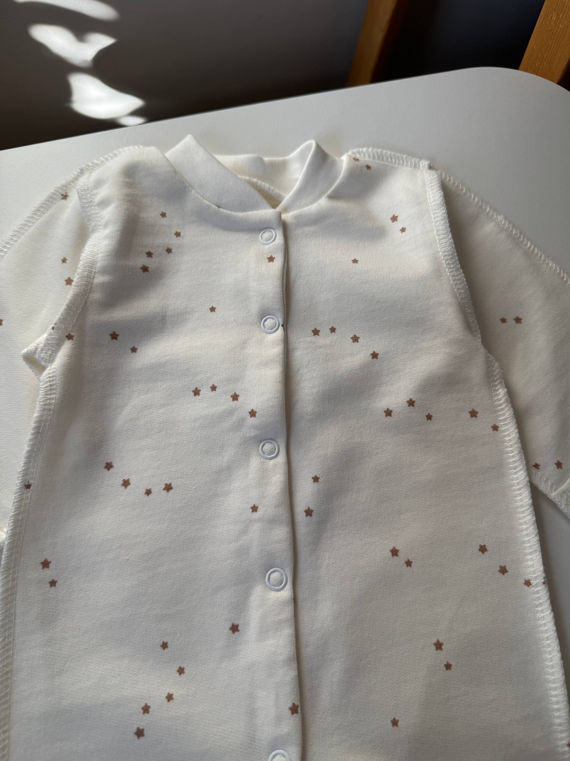 М'який чоловічок з теплого футера. Натуральна бавовна з м’яким начосом всередині дбайливо зберігає тепло та дозволяє шкірі дихати, а зручні кнопки по всій довжині роблять переодягання швидким і легким. Модель має закриті ніжки, манжети-антицарапки та правильний крій, що не сковує рухів немовляти. Це поєднання затишного дизайну та бездоганного комфорту, яке ідеально підходить для першого гардероба або виписки. Універсальний розмір: 56-62 (0-3 місяці).