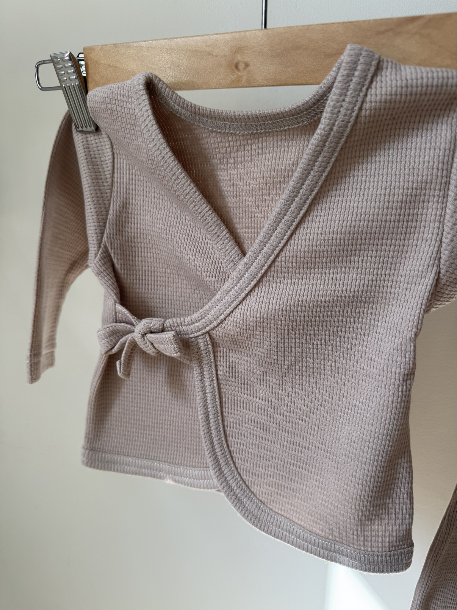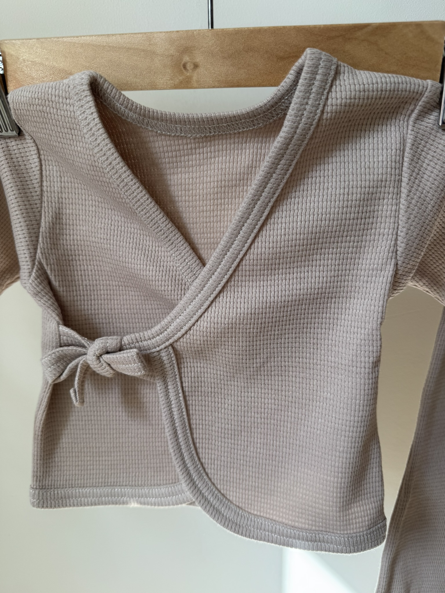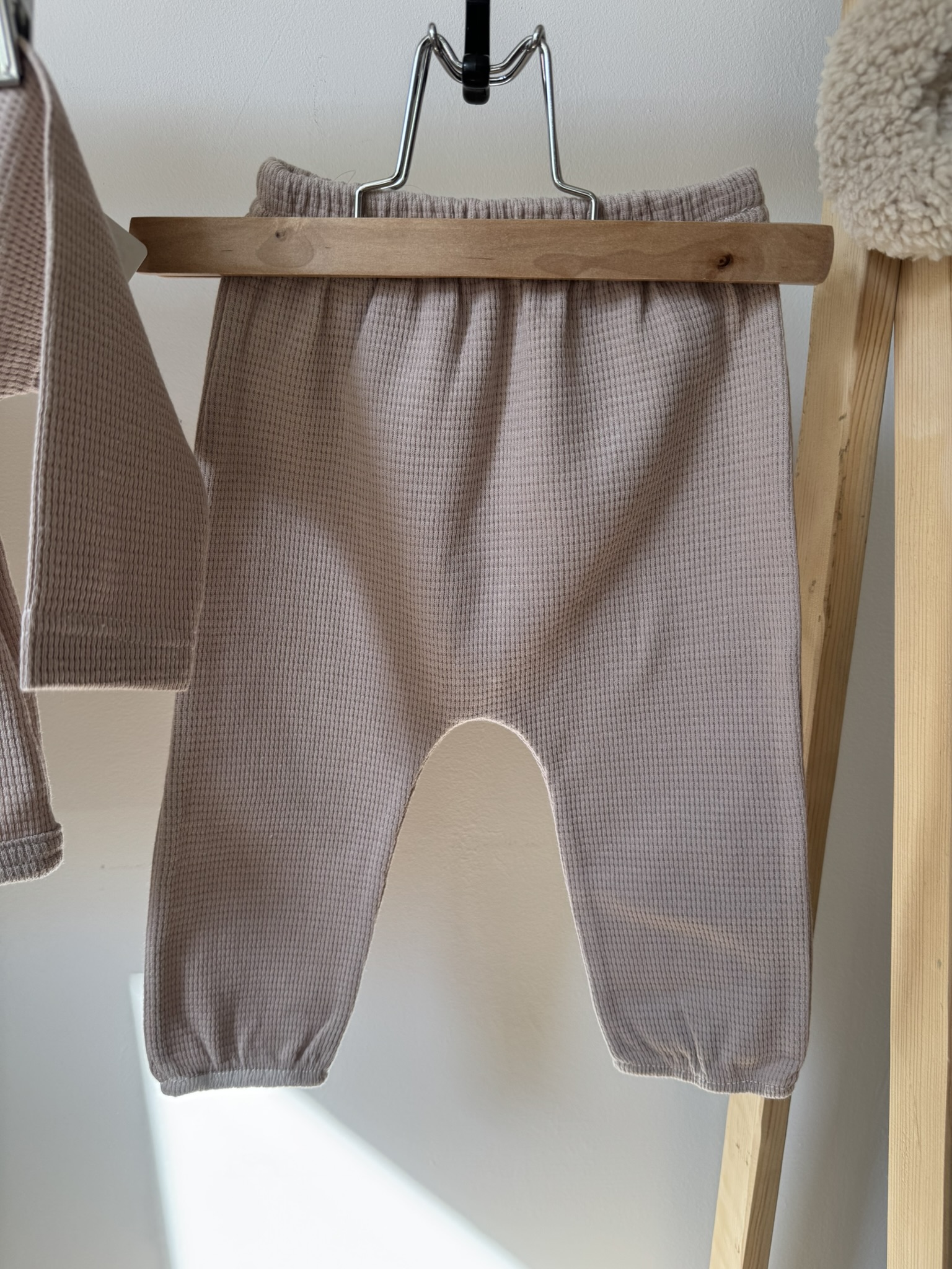 Ніжний та стильний комплект із двох одиниць, виконаний із інтерлоку-резинки для затишку вашого малюка. Фактурне бавовняне полотно вирізняється надзвичайною м'якістю та здатністю ідеально підлаштовуватися під кожний рух, не втрачаючи своєї форми. Особливістю набору є зручна сорочечка на запах, що фіксується за допомогою делікатної зав’язки, дозволяючи легко переодягнути немовля, не турбуючи його зайвими рухами через голову. Штанці з еластичною резинкою м’яко підтримують животик і забезпечують правильну посадку під підгузок, не створюючи зайвого тиску. Натуральний склад тканини дозволяє шкірі вільно дихати, підтримуючи комфортну температуру під час сну чи відпочинку. Це втілення витонченої простоти та функціональності, яке стане ідеальним вибором для першої капсули малюка. Розмір 68 (3-6 місяців).