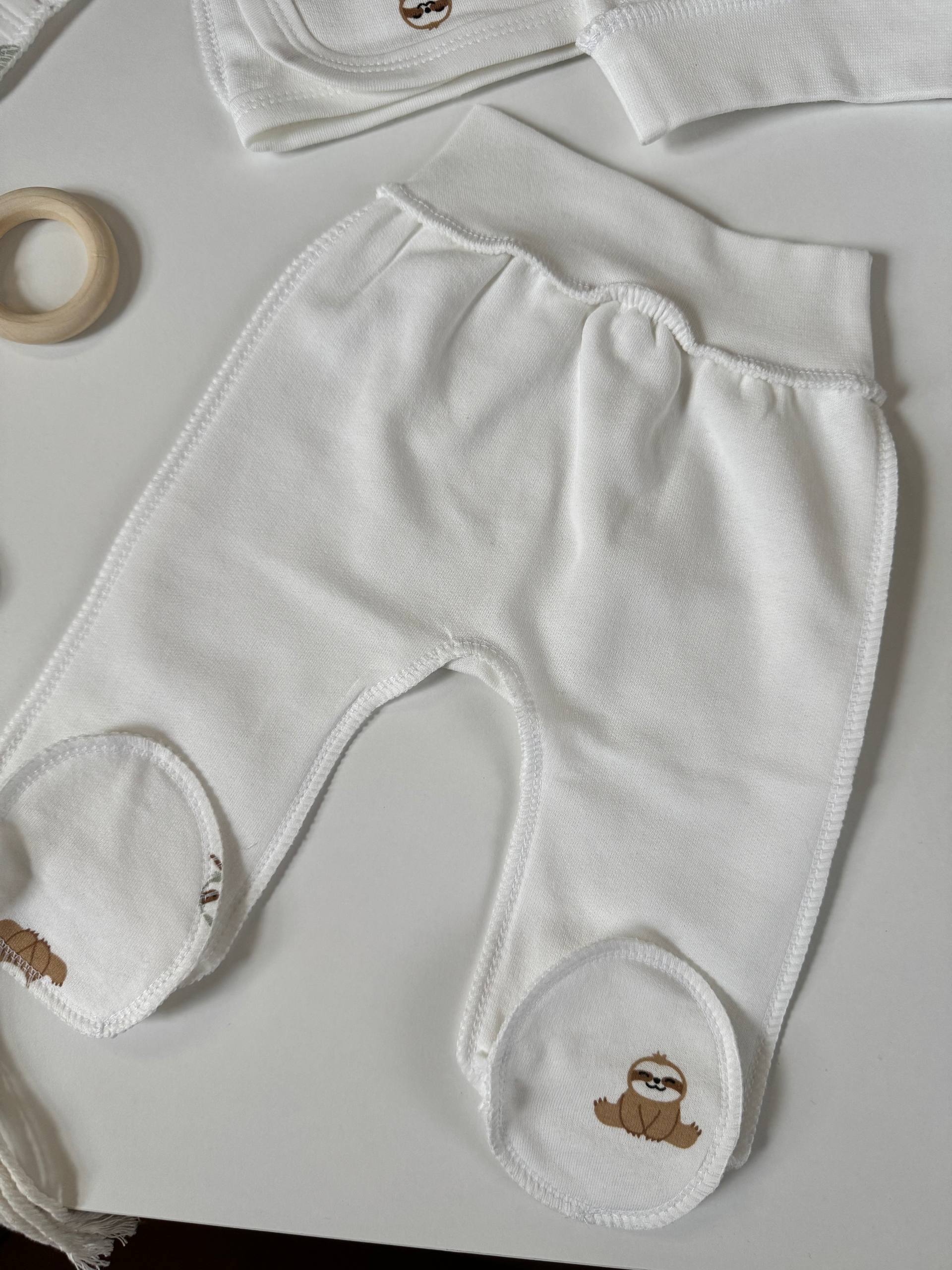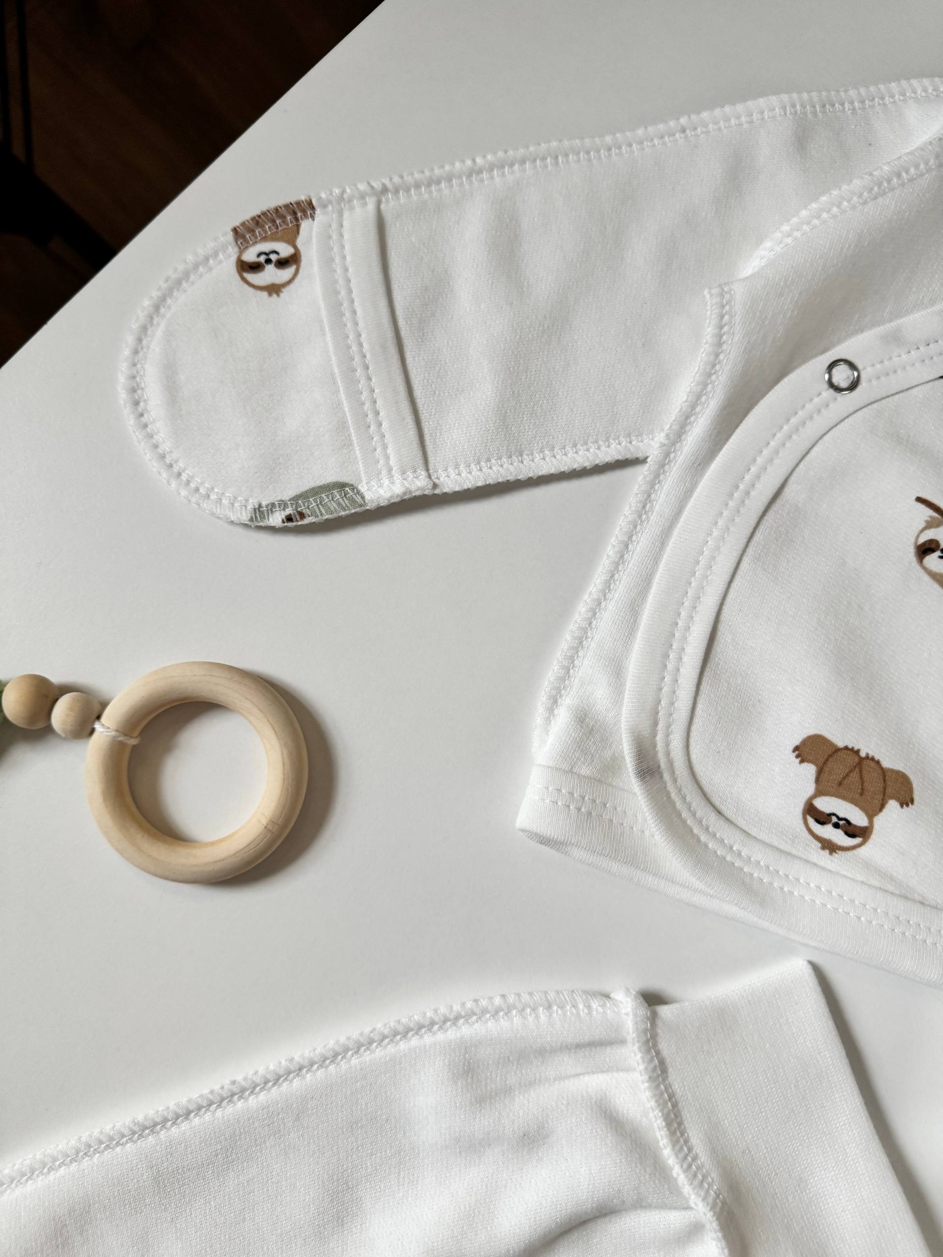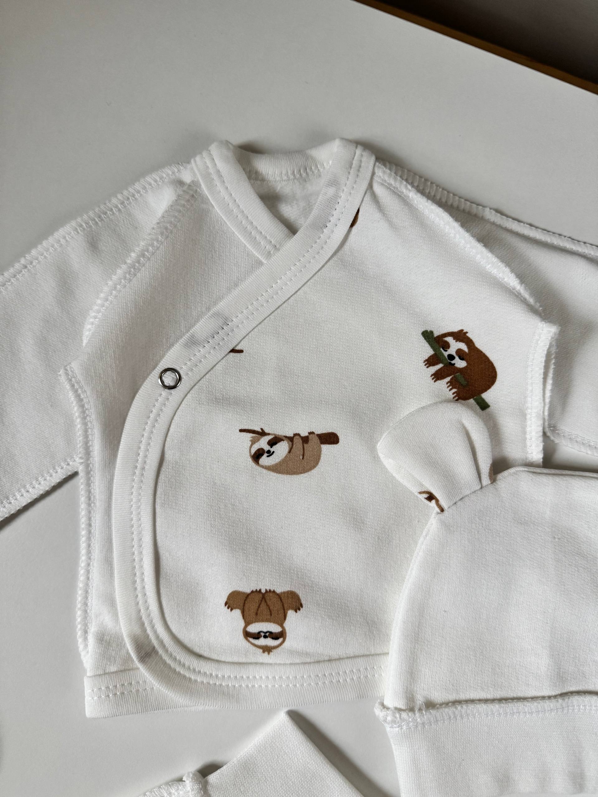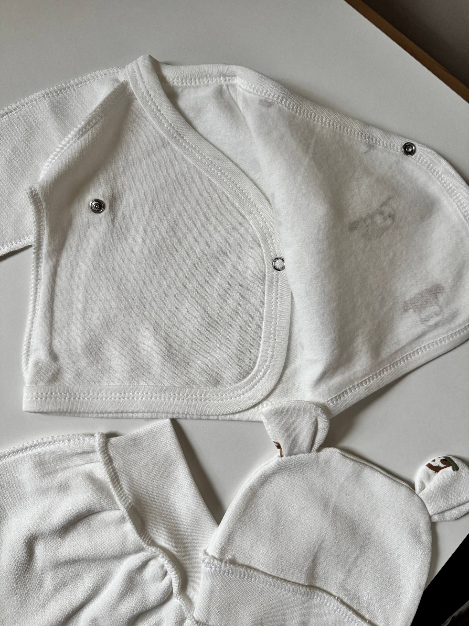 М’який та затишний комплект із трьох одиниць, виконаний з ніжного футеру для максимального комфорту немовляти. Натуральна бавовна з легким начісом всередині ідеально підтримує природне тепло тіла та дозволяє шкірі дихати. Набір включає зручну сорочечку з кнопками для швидкого переодягання, повзуни з м'якою резинкою та милу шапочку з вушками. Сорочка доповнена манжетами-антицарапками, які дбайливо ховають ручки, а правильний крій кожної речі не обмежує рухи малюка. Це ідеальний вибір для виписки або створення першої капсули в пологовий будинок. Розмір: 56 (0-1 місяць).