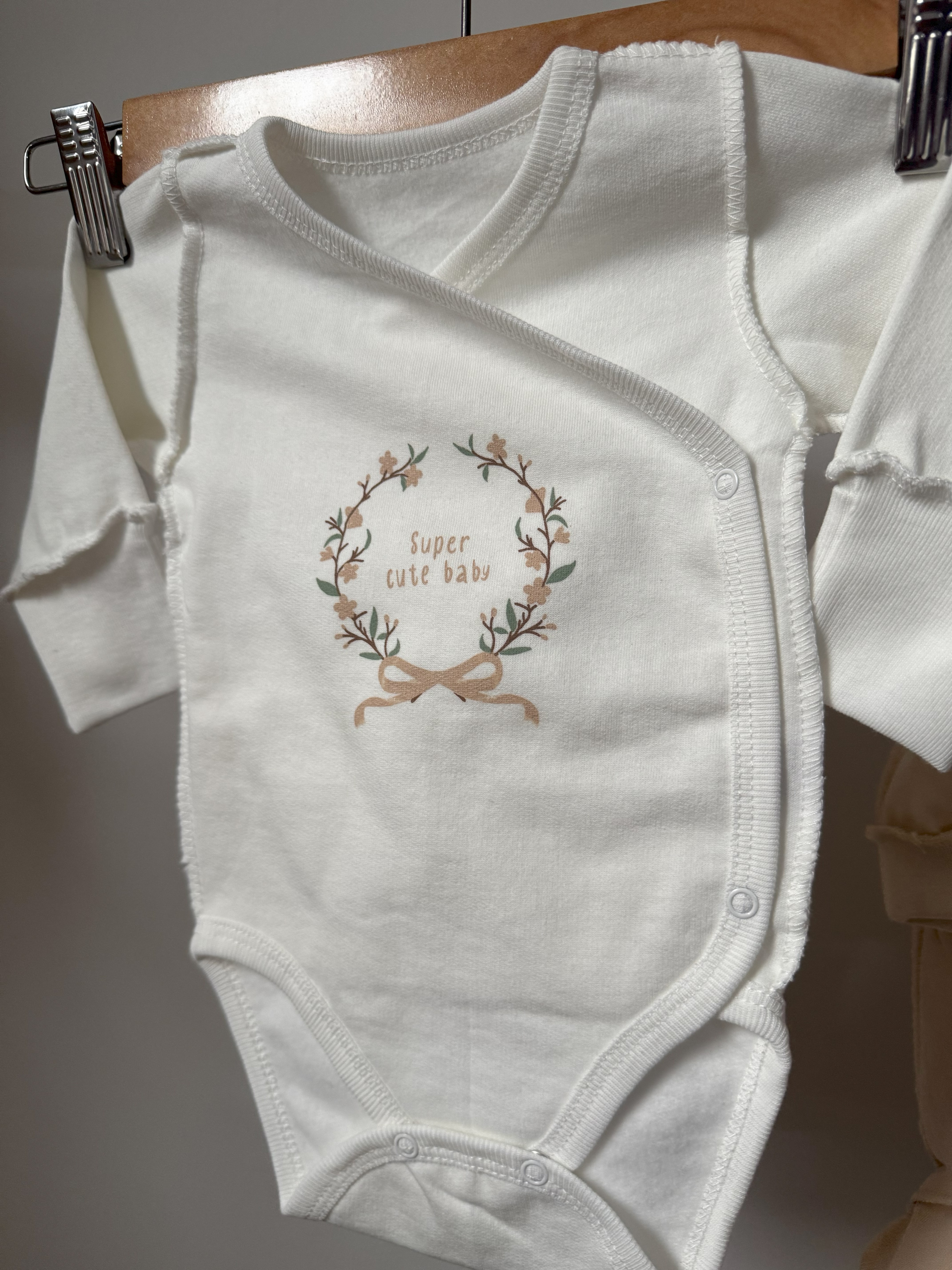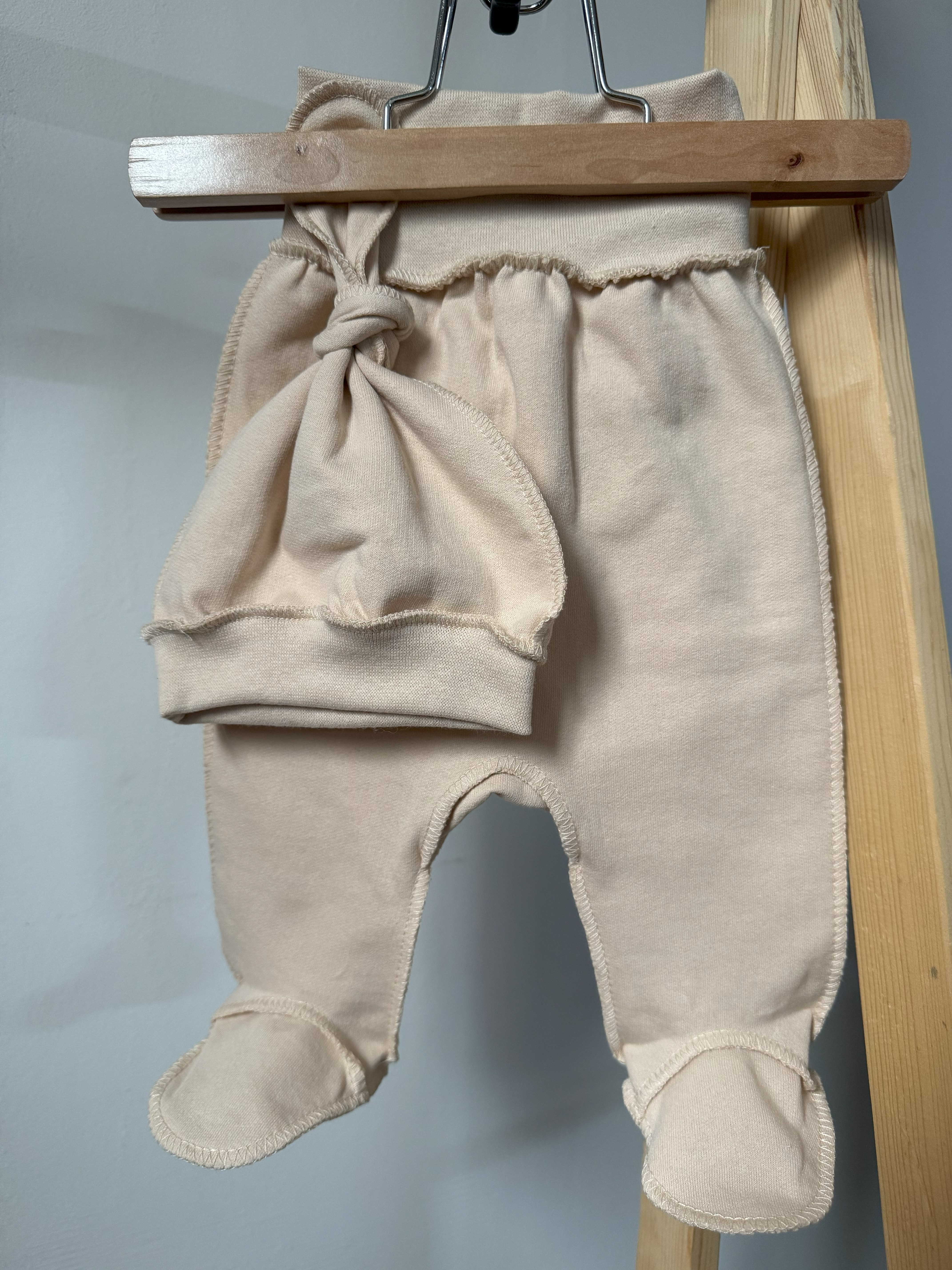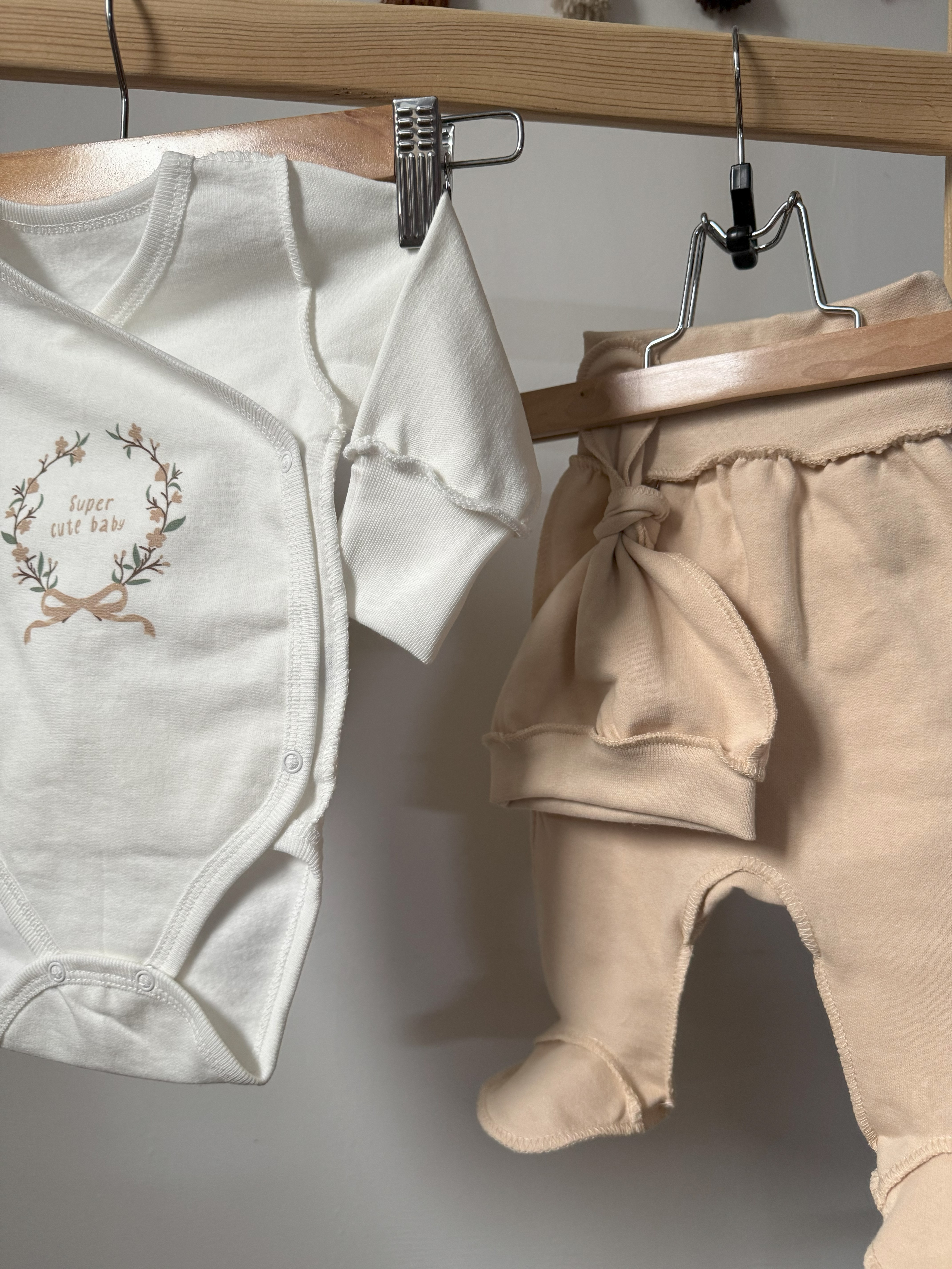 Затишний та неймовірно м’який набір із трьох одиниць, виконаний із футеру для особливого тепла вашого малюка. Натуральне бавовняне полотно з делікатним ворсом на звороті м’яко огортає тіло, підтримуючи природну температуру та дозволяючи шкірі вільно дихати. Комплект складається з практичного боді на кнопках, еластичних повзунків із закритими ніжками та стильної шапочки з вузликом, що делікатно прилягає до голівки. Боді доповнене зручними манжетами-антицарапками для захисту ручок, а ергономічний крій кожної деталі забезпечує повну свободу перших рухів немовляти. Це гармонійне поєднання функціональності та ніжного дизайну, яке стане ідеальною основою для виписки або домашнього відпочинку. Розмір: 56 (0-1 місяць).