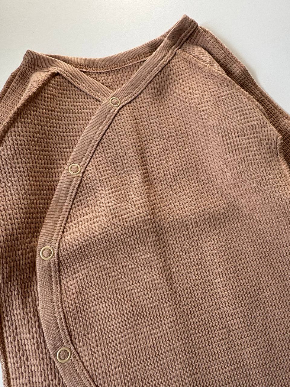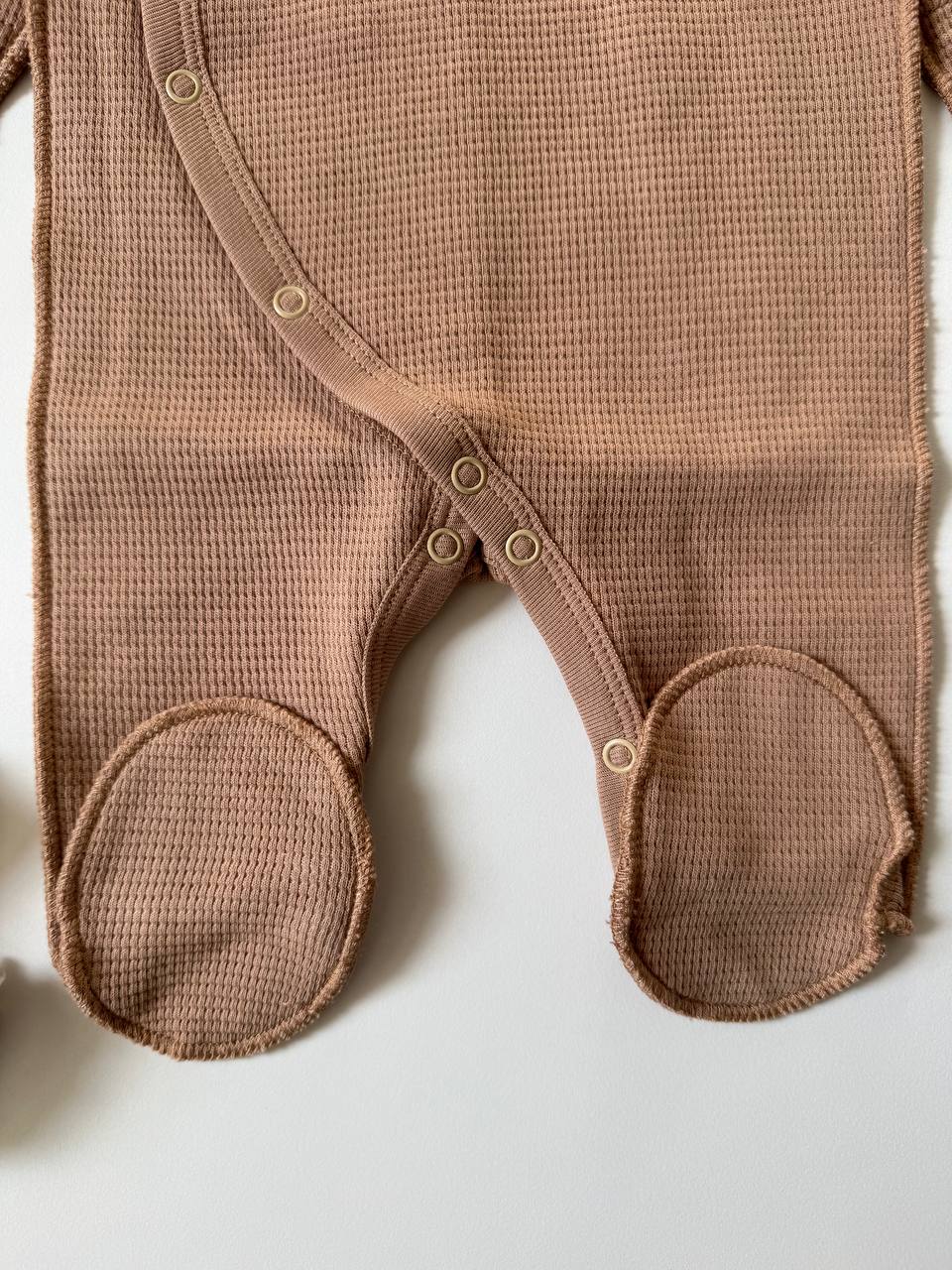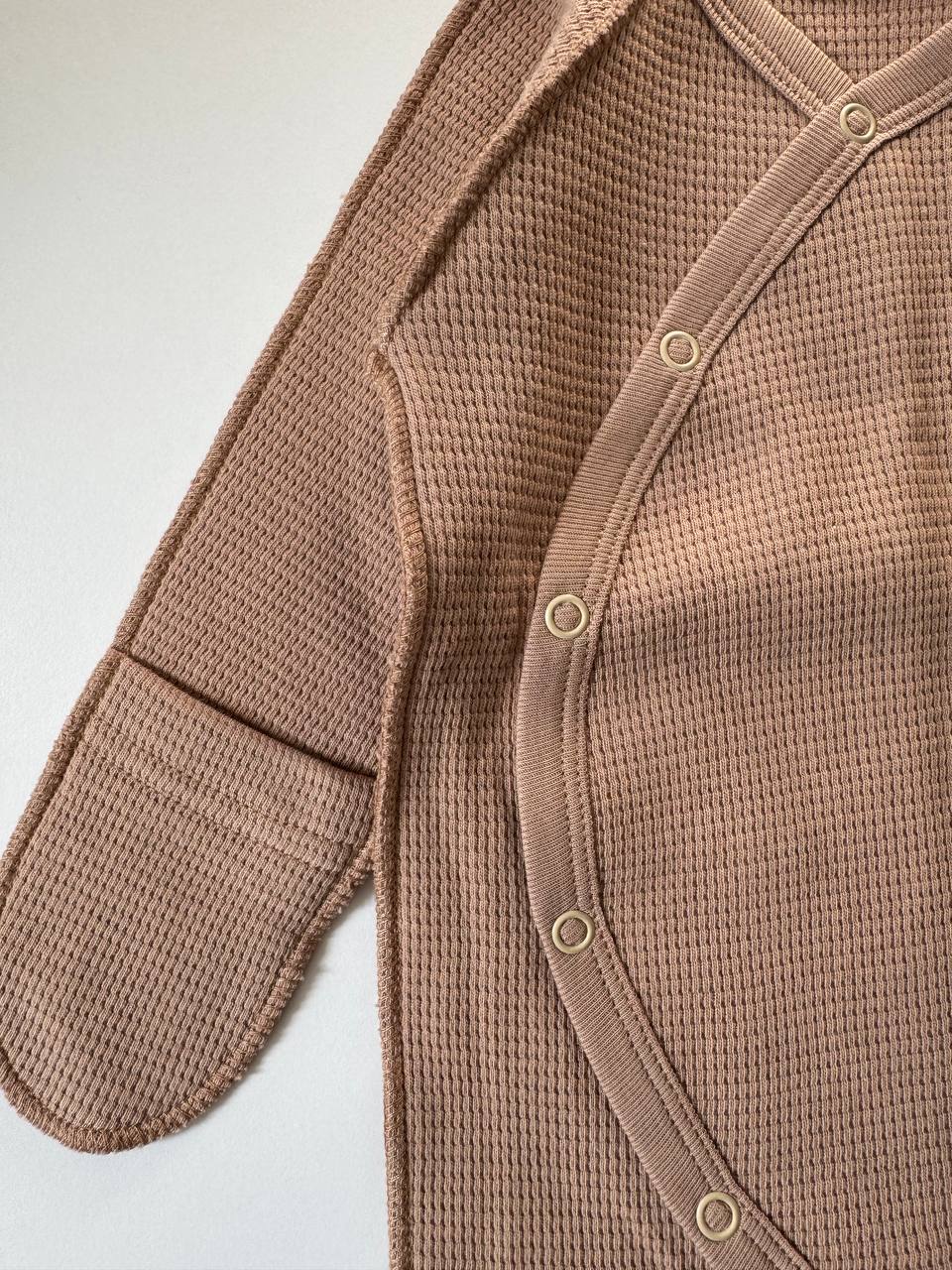 Ніжний та неймовірно стильний чоловічок, виконаний з натуральної вафельної тканини для особливого затишку вашого малюка. Об'ємна фактура бавовняного полотна не лише виглядає естетично, а й чудово пропускає повітря, забезпечуючи ідеальну терморегуляцію та комфорт у будь-яку пору року. Зручні кнопки по всій довжині роблять переодягання та зміну підгузка швидкими й легкими, не турбуючи немовля. Модель має закриті ніжки, спеціальні манжети-антицарапки для захисту ручок та правильний анатомічний крій, що дарує повну свободу першим рухам. Це гармонійне поєднання сучасного дизайну та природної м'якості, яке ідеально підійде для першої фотосесії, виписки або стильних домашніх буднів. Розмір: 56 (0-1 місяць).