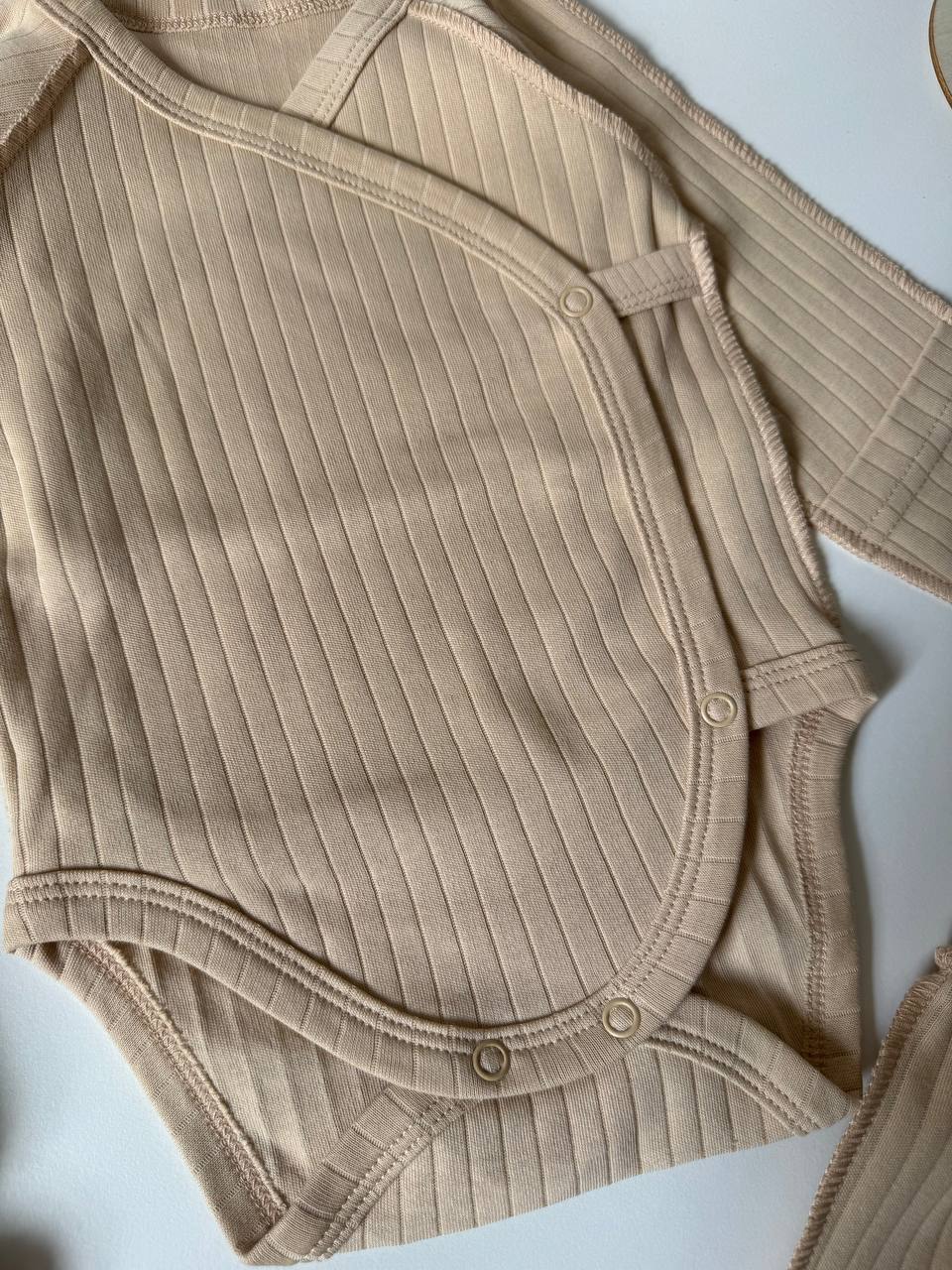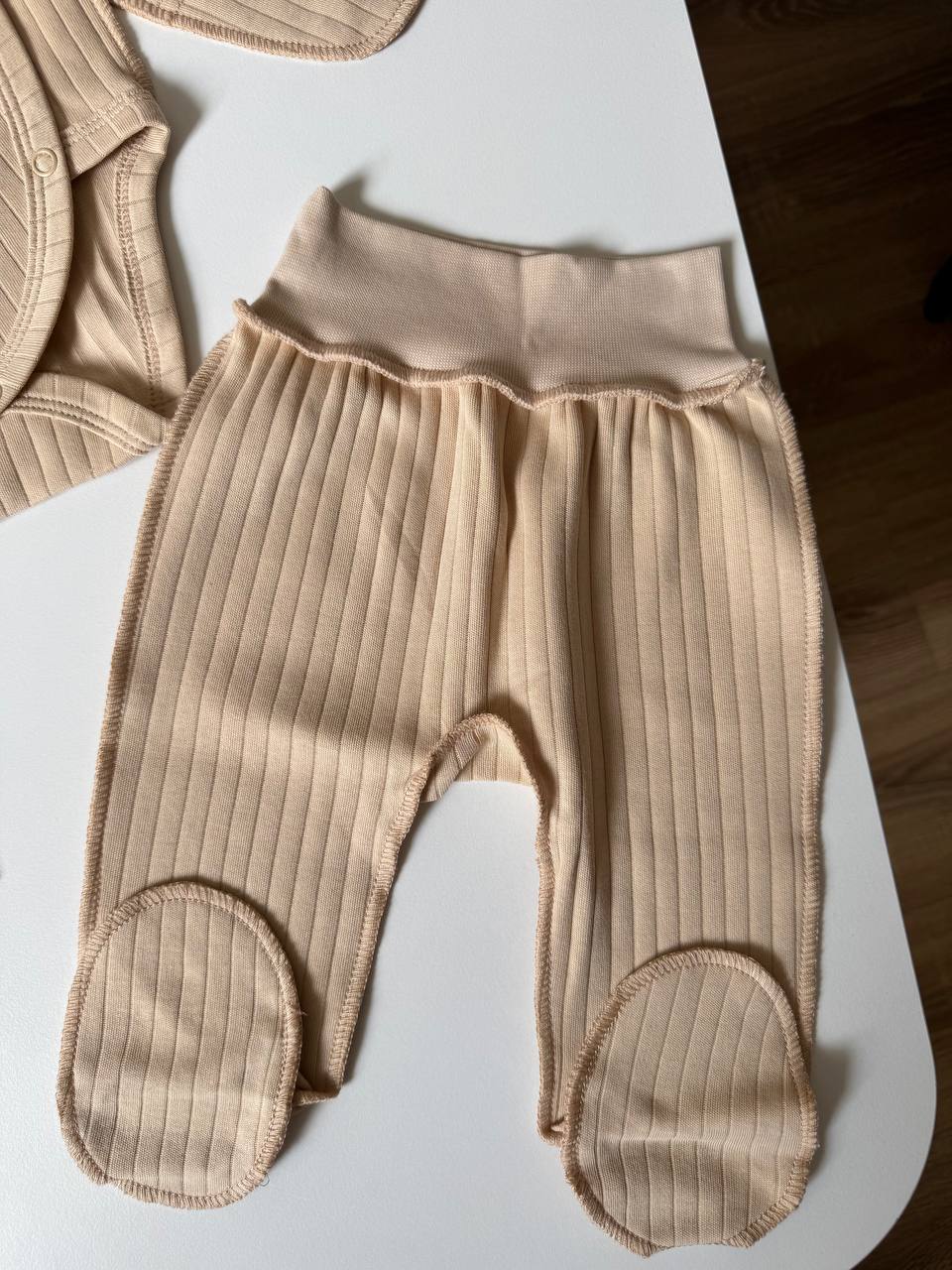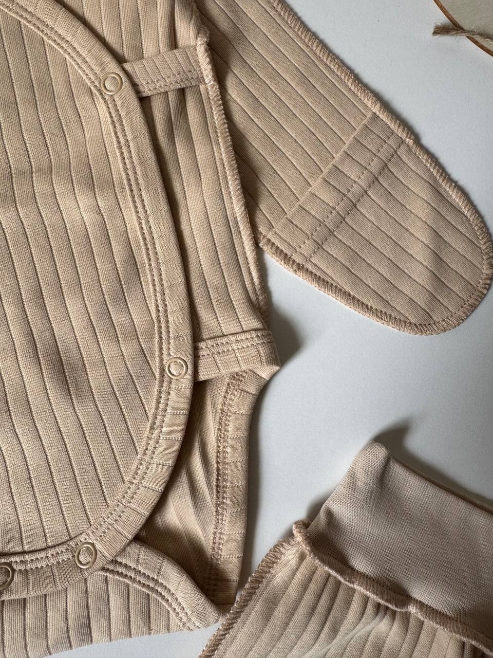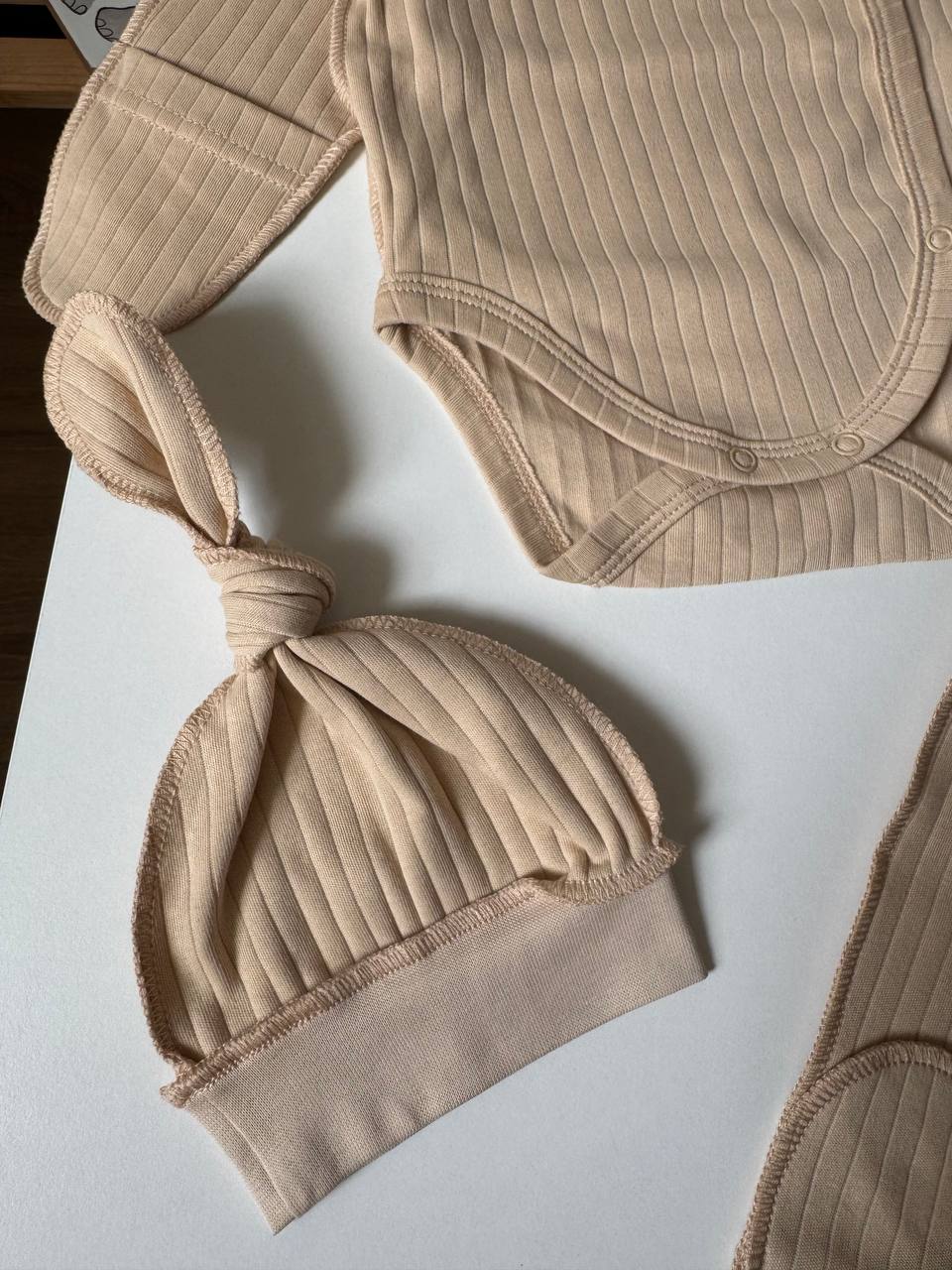 Ніжний та невагомий комплект із трьох одиниць, виконаний з преміального інтерлоку для першого гардероба малюка. Бавовняна тканина дозволяє чутливій шкірі вільно дихати та дарує відчуття абсолютного затишку впродовж усього дня. Набір включає зручне боді з кнопками для легкого переодягання, повзуни з м'якою еластичною резинкою та стильну шапочку з вузликом, що делікатно захищає голівку немовляти. Боді доповнене манжетами-антицарапками, які дбайливо ховають ручки, а анатомічний крій кожної речі забезпечує повну свободу перших рухів. Це бездоганне поєднання естетичного дизайну та комфорту, що ідеально підходить для виписки або на щодень. Розмір: 62 (1-3 місяці).