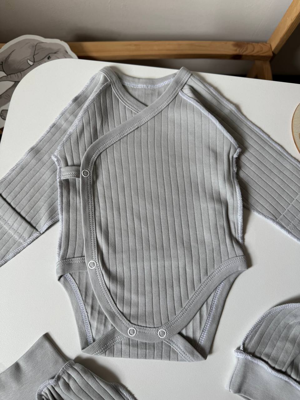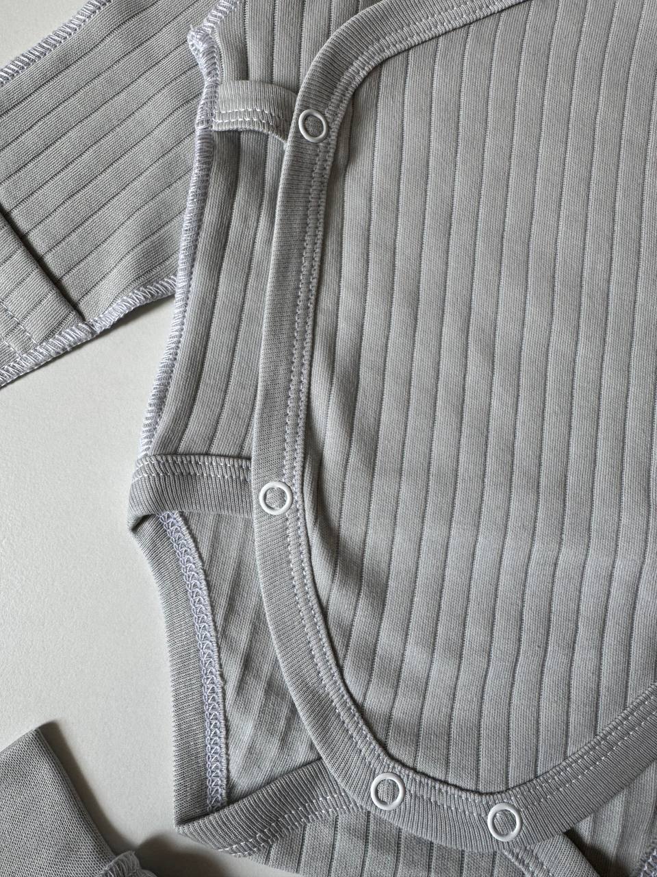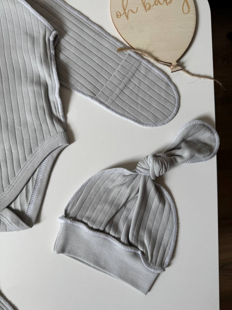 Ніжний та невагомий комплект із трьох одиниць, виконаний з преміального інтерлоку для першого гардероба малюка. Бавовняна тканина дозволяє чутливій шкірі вільно дихати та дарує відчуття абсолютного затишку впродовж усього дня. Набір включає зручне боді з кнопками для легкого переодягання, повзуни з м'якою еластичною резинкою та стильну шапочку з вузликом, що делікатно захищає голівку немовляти. Боді доповнене манжетами-антицарапками, які дбайливо ховають ручки, а анатомічний крій кожної речі забезпечує повну свободу перших рухів. Це бездоганне поєднання естетичного дизайну та комфорту, що ідеально підходить для виписки або на щодень. Розміри: 56 (0-1 місяці), 62 (1-3 місяці).