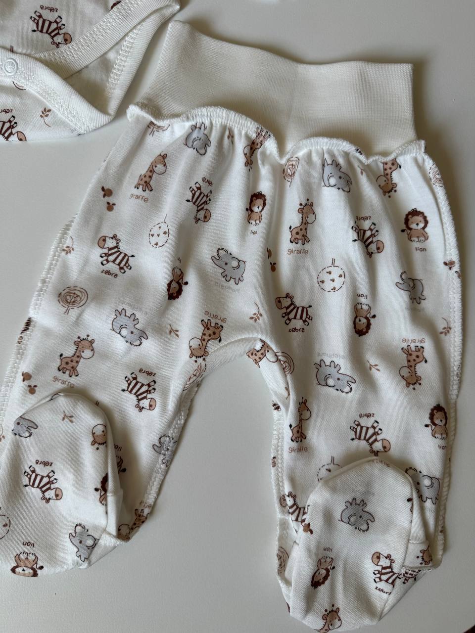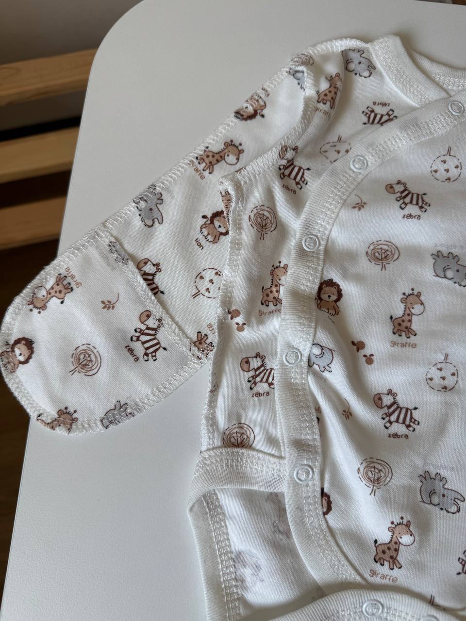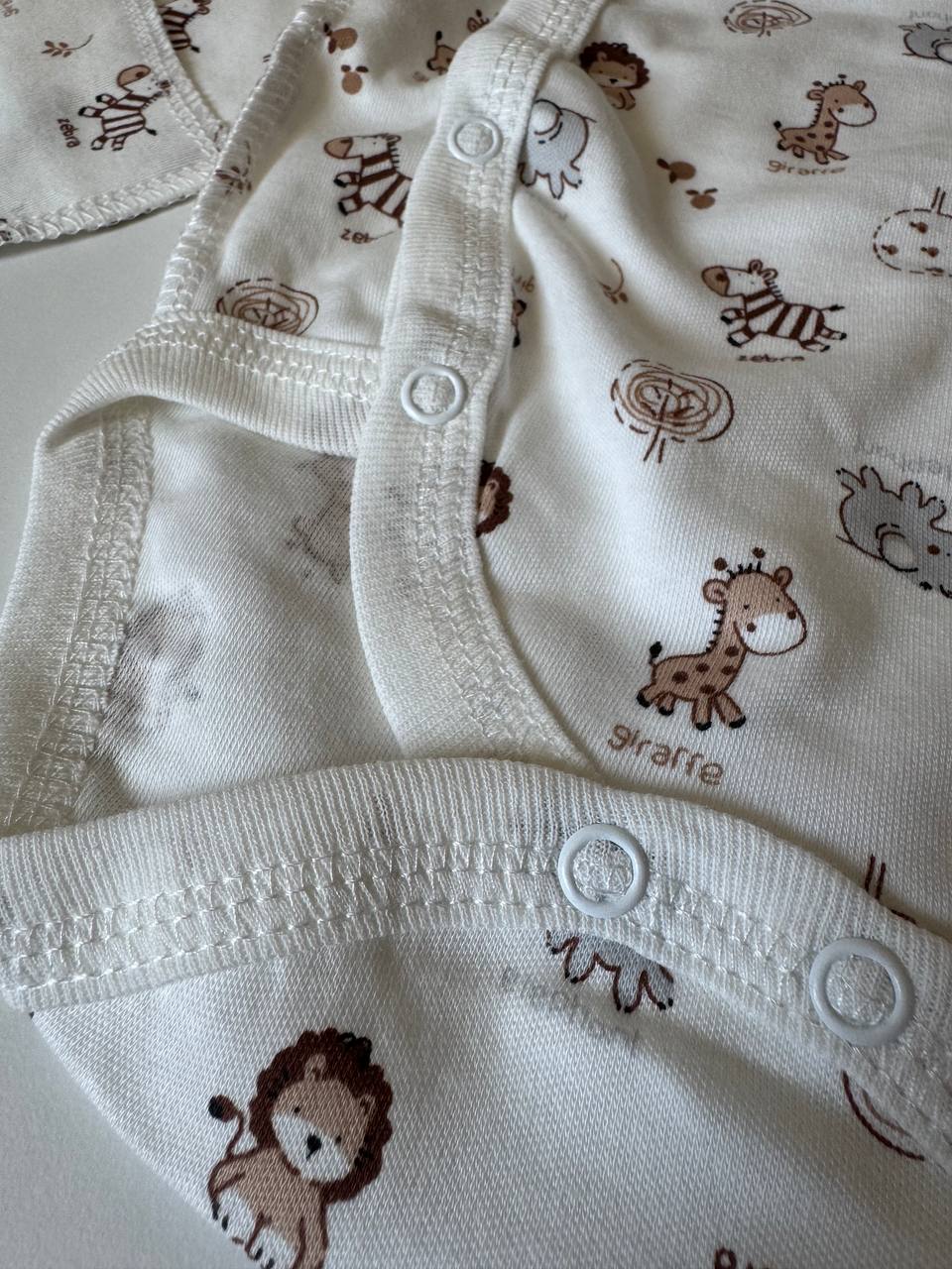 М’який і теплий комплект із двох одиниць, виконаний з ніжного інтерлоку для затишних буднів малюка. Натуральна бавовна дбайливо пропускає повітря та дозволяє шкірі дихати, забезпечуючи дитині спокійний сон і комфортне дозвілля. Боді має зручні кнопки по всій довжині для легкого переодягання та спеціальні манжети-антицарапки, що надійно закривають ручки. Повзунята з високою еластичною резинкою та закритими ніжками мають правильний крій, який не сковує рухів і дарує повну свободу першій активності немовляти. Це поєднання витонченого дизайну та функціональності, що стане ідеальною основою базового гардероба. Універсальний розмір: 56-62 (0-3 місяці).