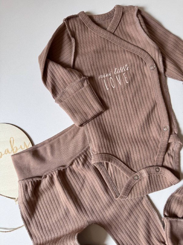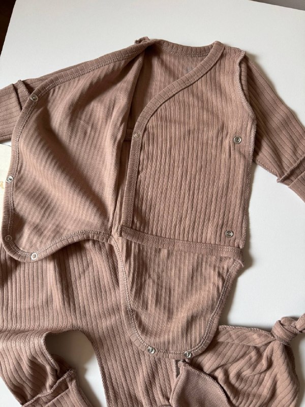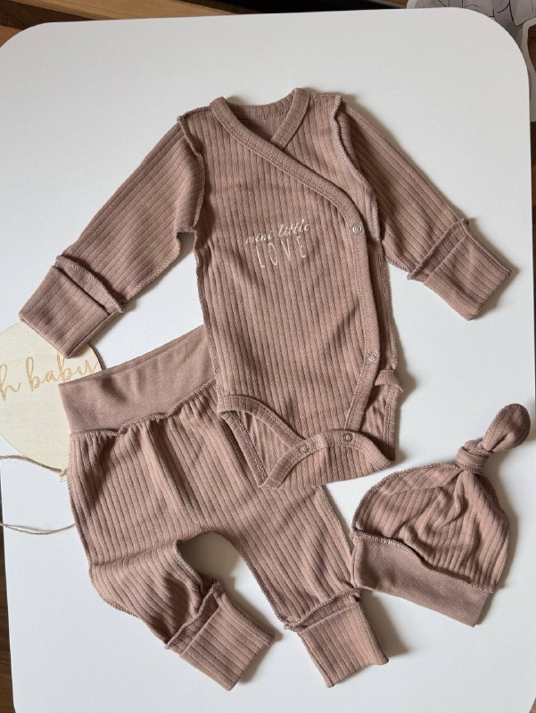 Практичний комплект для новонародженого 56 розміру — базовий набір одягу для малюка. Боді, повзунки та шапочка-вузлик виготовлені з м’якого інтерлоку, що забезпечує комфорт і приємні відчуття під час носіння. Тканина добре пропускає повітря та підтримує оптимальну температуру. Комплект ідеально підходить для виписки, прогулянок і домашнього використання.