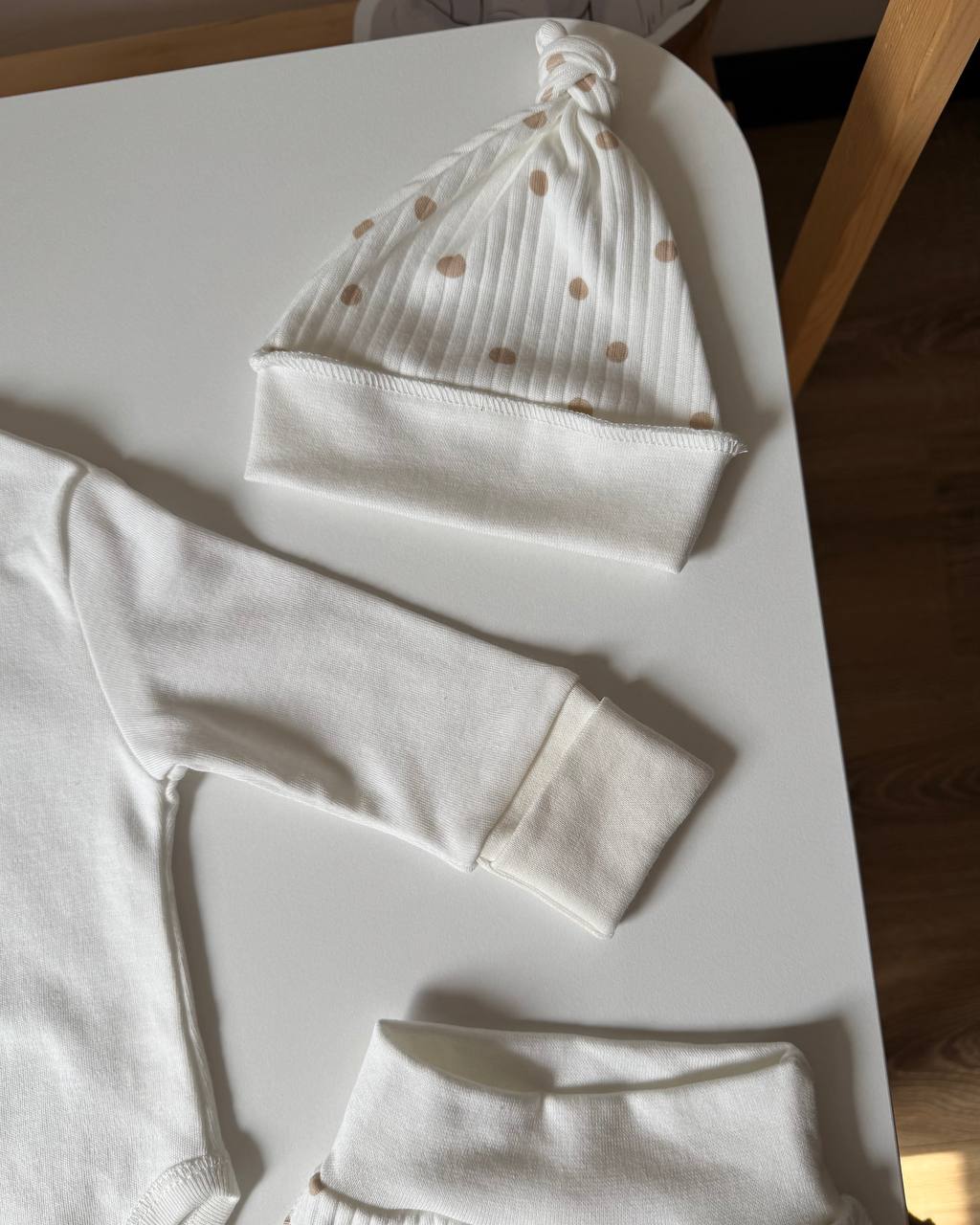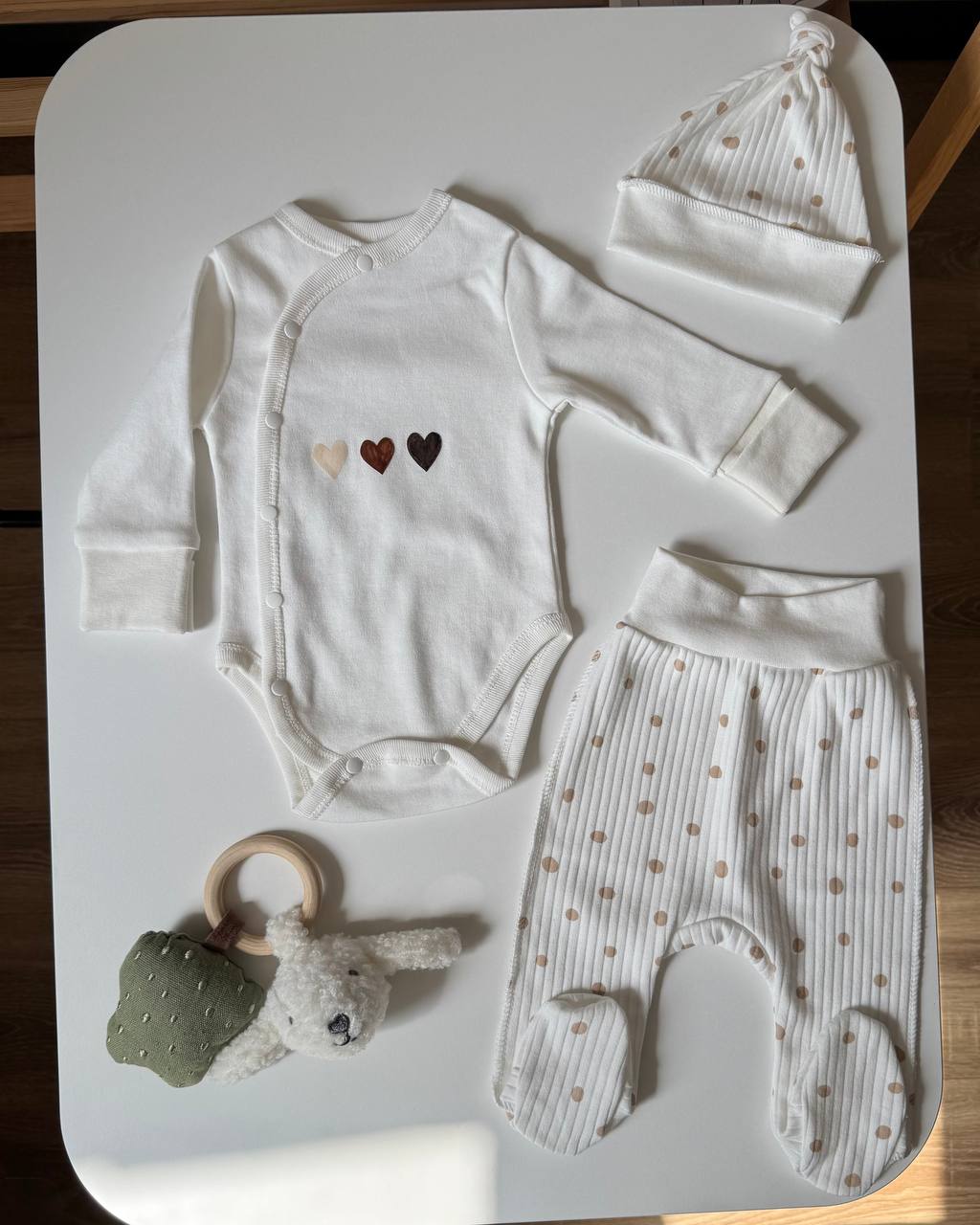 Комплект для новонародженого 56 розміру з інтерлоку — зручний і практичний набір для щоденного використання. У комплект входять боді, повзунки та шапочка-вузлик, що створюють стильний і комфортний образ для малюка. М’який інтерлок приємний до тіла, добре дихає та підходить для чутливої шкіри. Завдяки продуманому крою одяг не сковує рухів і забезпечує максимальний комфорт.