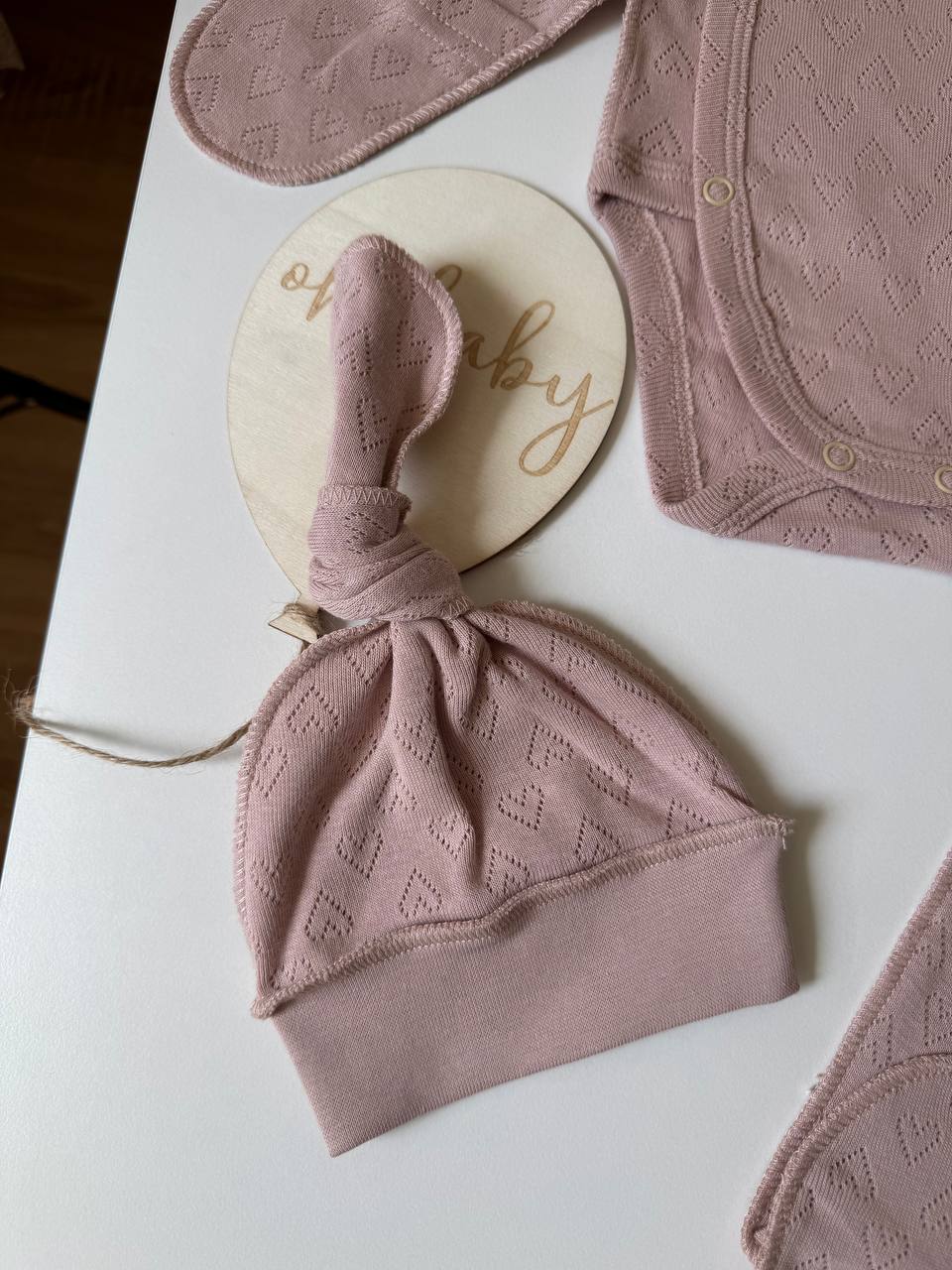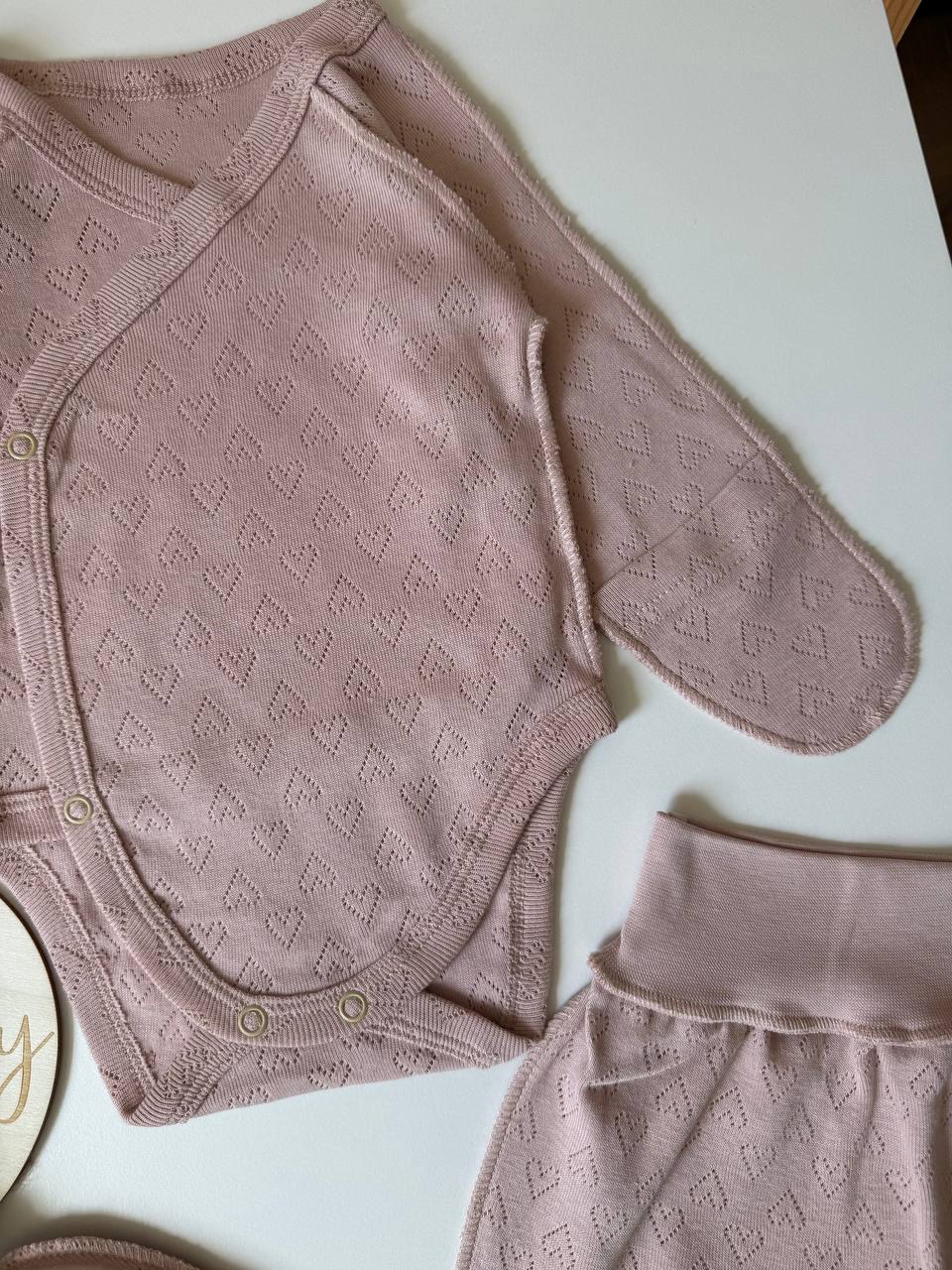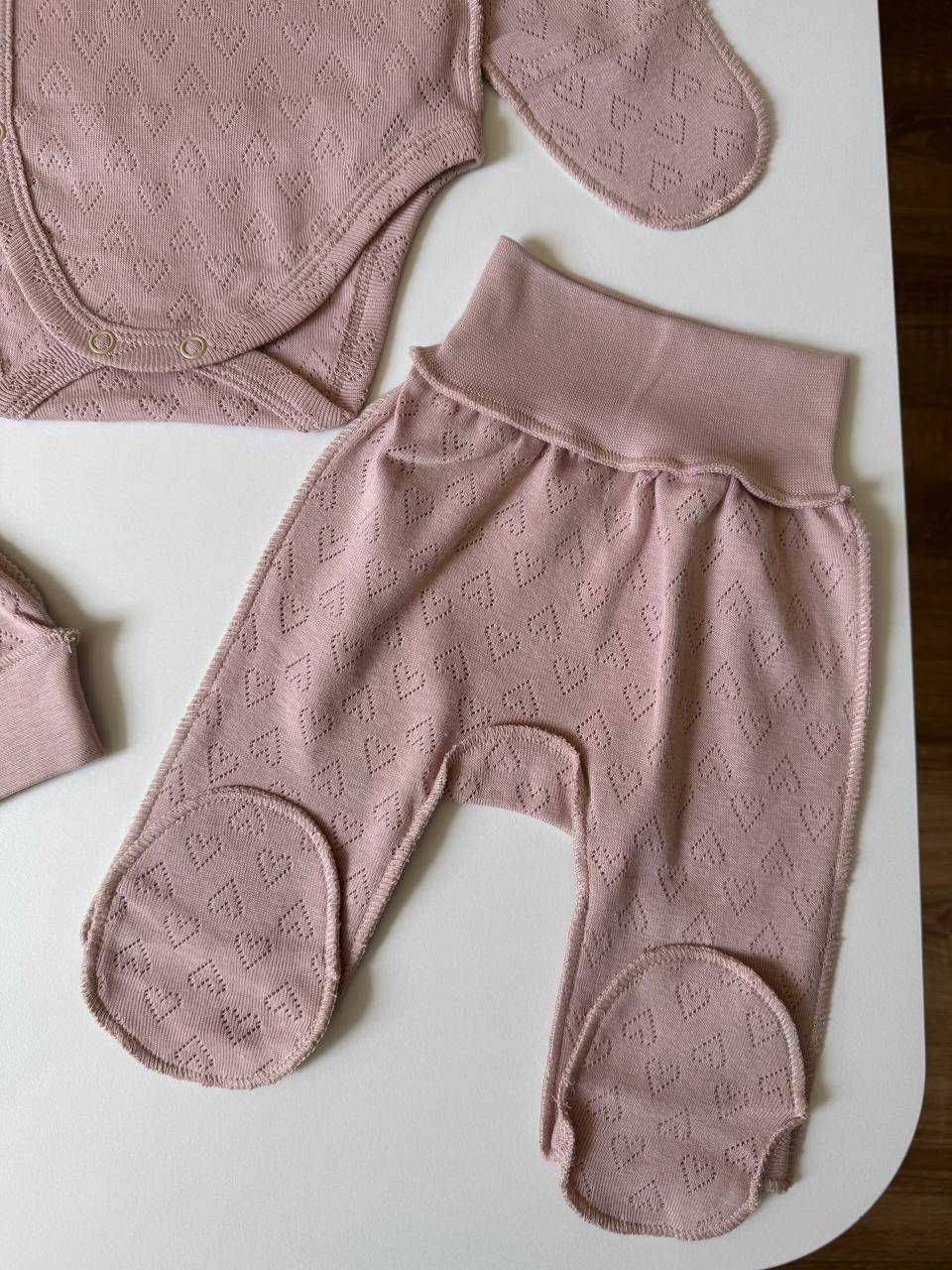 Витончений та неймовірно ніжний комплект із трьох одиниць, створений із невагомого трансферлі (рібана) для особливого затишку вашого малюка. Унікальне ажурне плетіння бавовняного полотна з дрібною перфорацією забезпечує ідеальну циркуляцію повітря, даруючи шкірі дитини відчуття постійної свіжості та невагомості. Набір складається з практичного боді на кнопках, еластичних повзунків із закритими ніжками та чарівної шапочки з вузликом, що м’яко фіксується на голівці. Особлива текстура тканини не лише виглядає естетично та вишукано, а й має надзвичайну м'якість, що ідеально підходить для найчутливішої шкіри немовляти. Анатомічно правильний крій кожної деталі дарує повну свободу першим рухам, роблячи цей комплект бездоганним вибором для урочистої виписки, першої фотосесії або теплих домашніх моментів. Розміри: 56 (0-1 місяць), 62 (1-3 місяці).