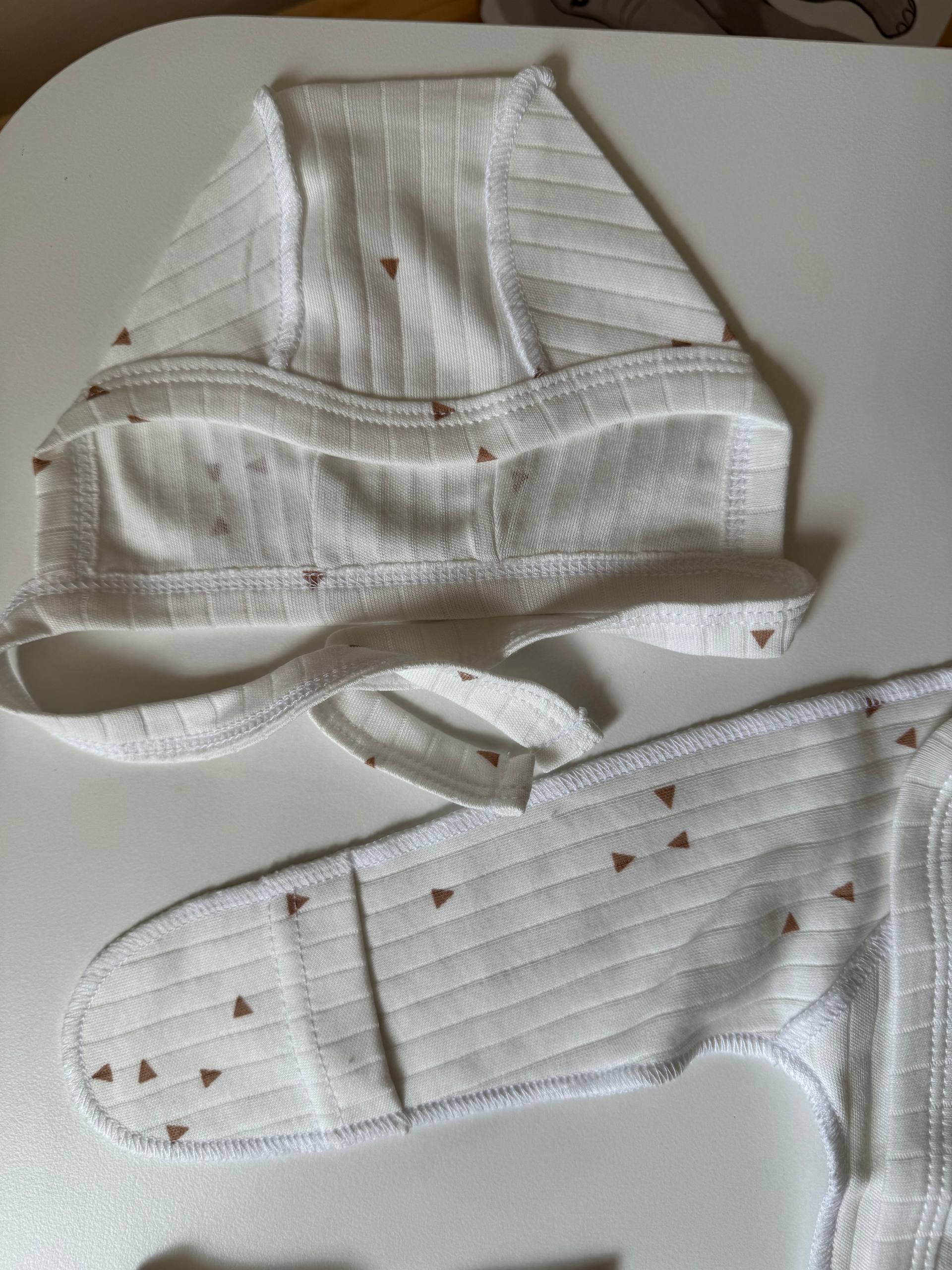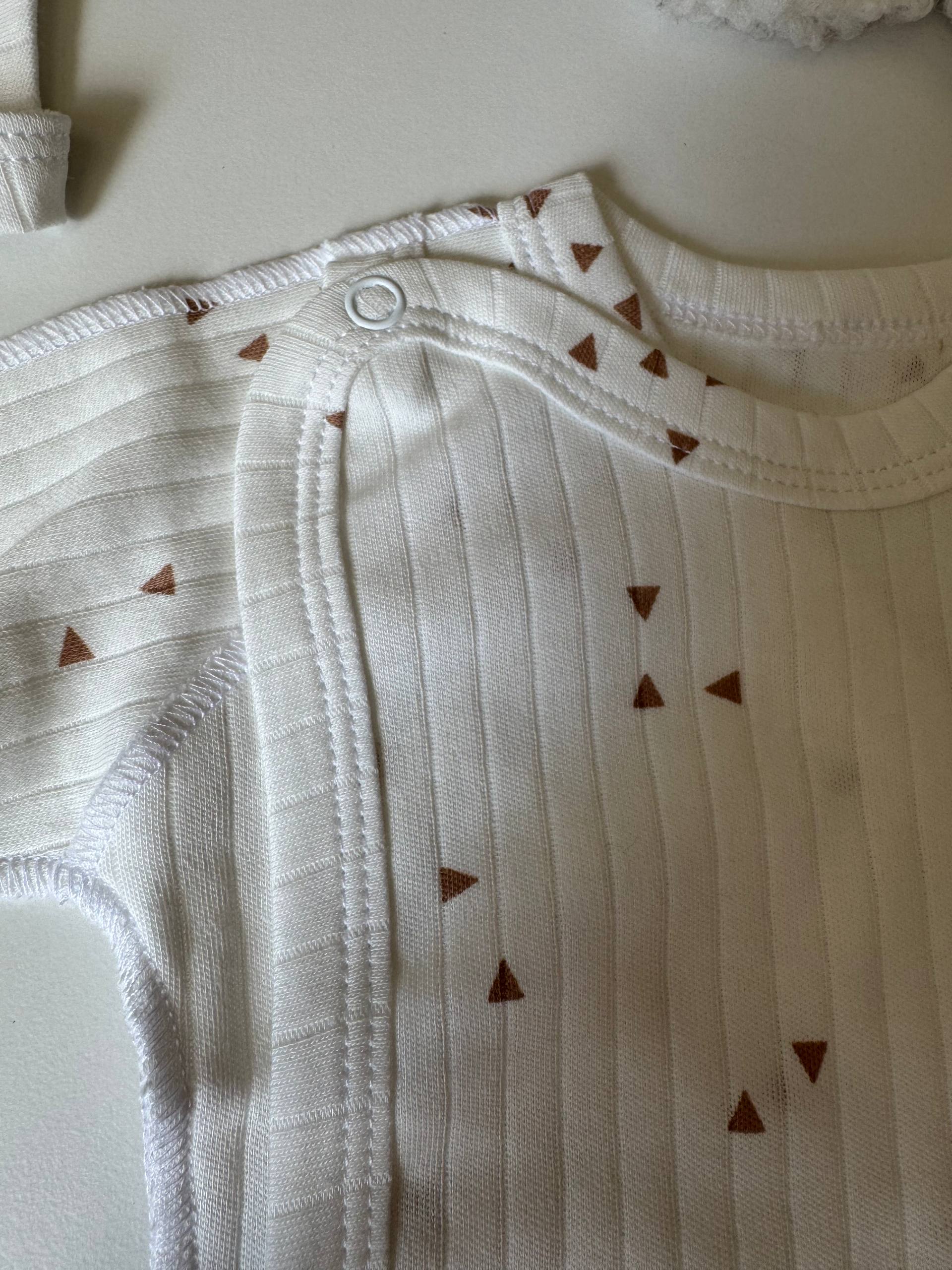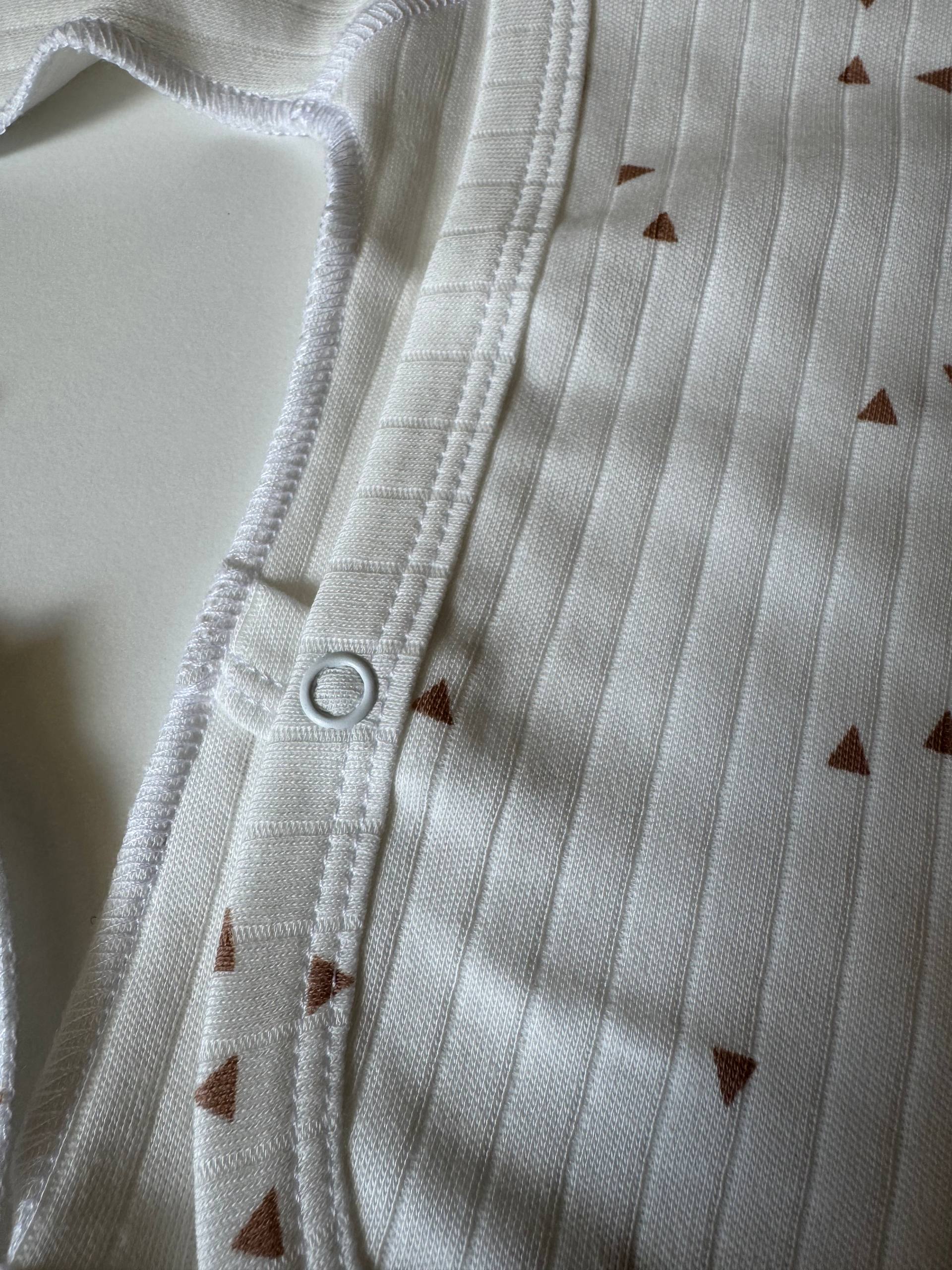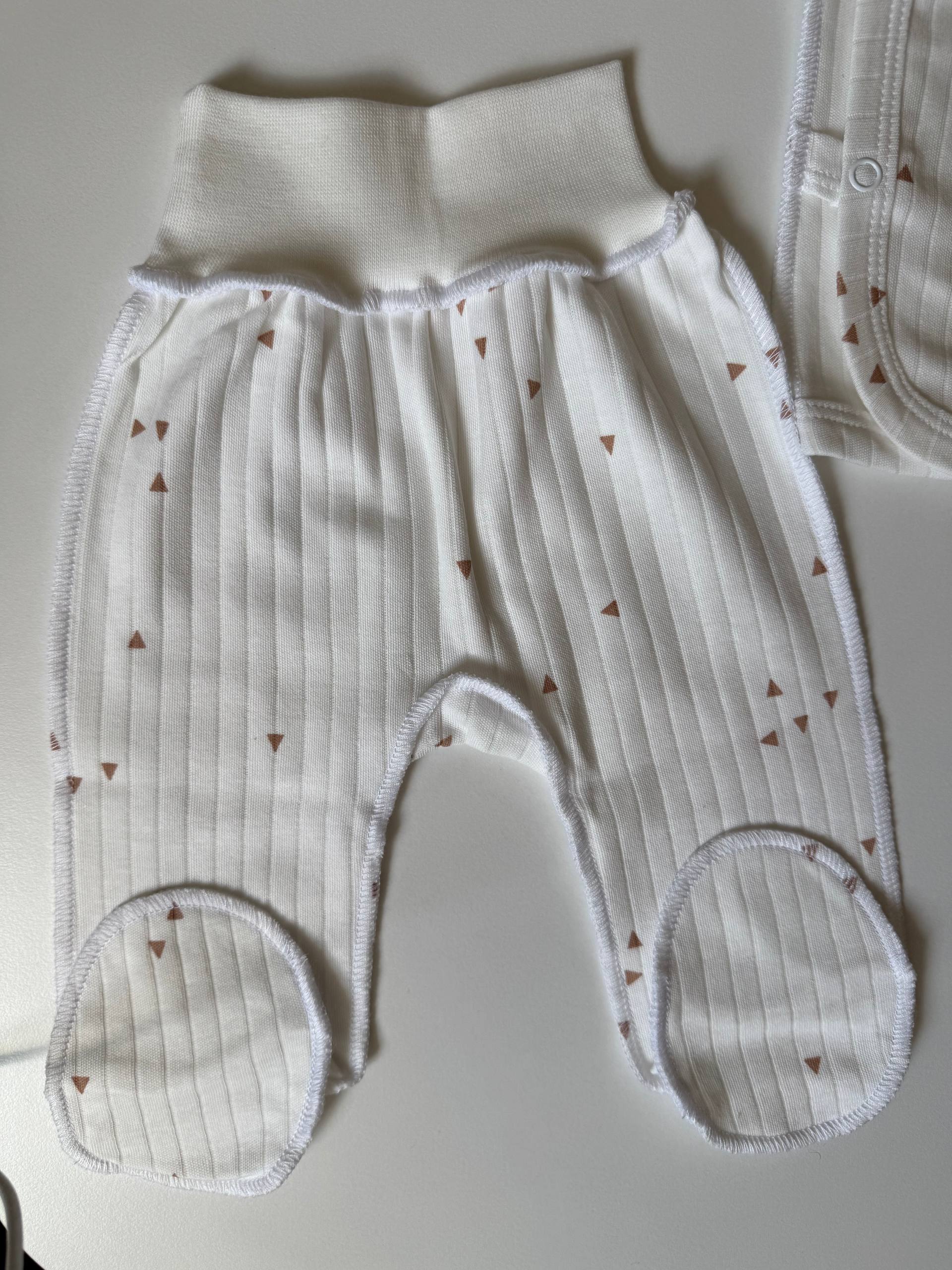 Ніжний та невагомий комплект із трьох одиниць, виконаний з інтерлоку для найпершого гардероба малюка. Бавовняна тканина дозволяє чутливій шкірі вільно дихати та дарує відчуття абсолютного затишку впродовж усього дня. Набір включає сорочку з кнопками для легкого переодягання, повзуни з м'якою еластичною резинкою та чепчик, що делікатно захищає голівку немовляти. Сорочка доповнена манжетами-антицарапками, які дбайливо ховають ручки, а анатомічний крій кожної речі забезпечує повну свободу перших рухів. Це бездоганне поєднання естетичного дизайну та комфорту, що ідеально підходить для виписки або на щодень. Розмір: 56 (0-1 місяць).