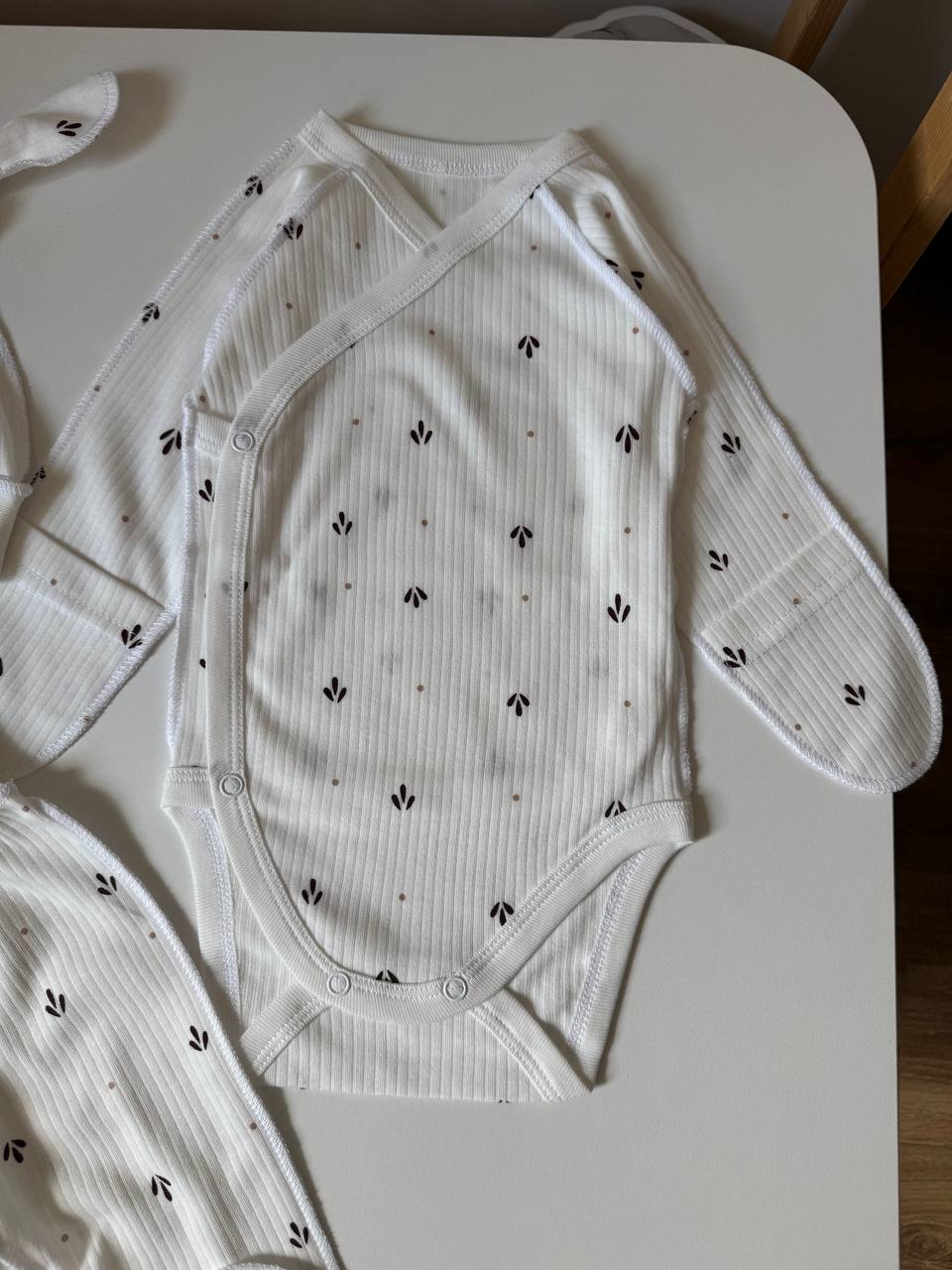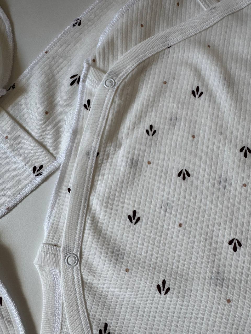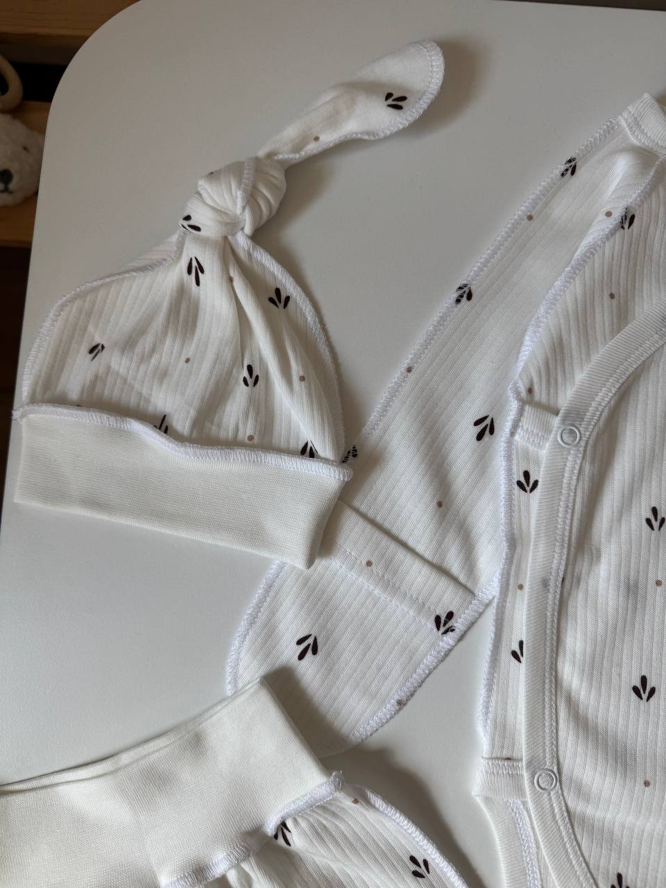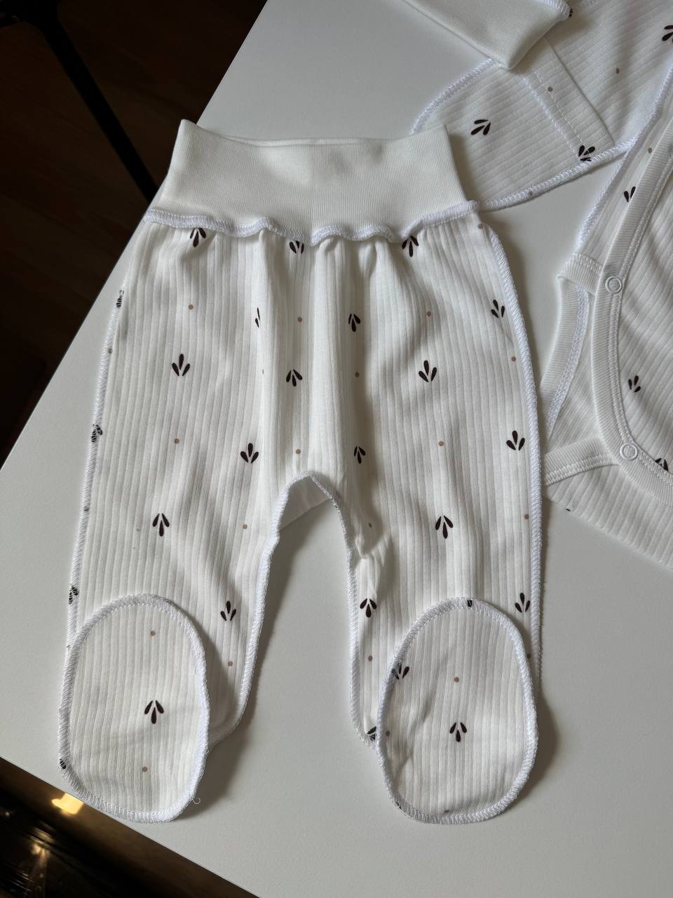 Ніжний та невагомий комплект із трьох одиниць, виконаний з преміального інтерлоку для найпершого гардероба малюка. Бавовняна тканина дозволяє чутливій шкірі вільно дихати та дарує відчуття абсолютного затишку впродовж усього дня. Набір включає зручне боді з кнопками для легкого переодягання, повзуни з м'якою еластичною резинкою та стильну шапочку з вузликом, що делікатно захищає голівку немовляти. Боді доповнене манжетами-антицарапками, які дбайливо ховають ручки, а анатомічний крій кожної речі забезпечує повну свободу перших рухів. Це бездоганне поєднання естетичного дизайну та комфорту, що ідеально підходить для виписки або на щодень. Розмір: 62 (1-3 місяці).