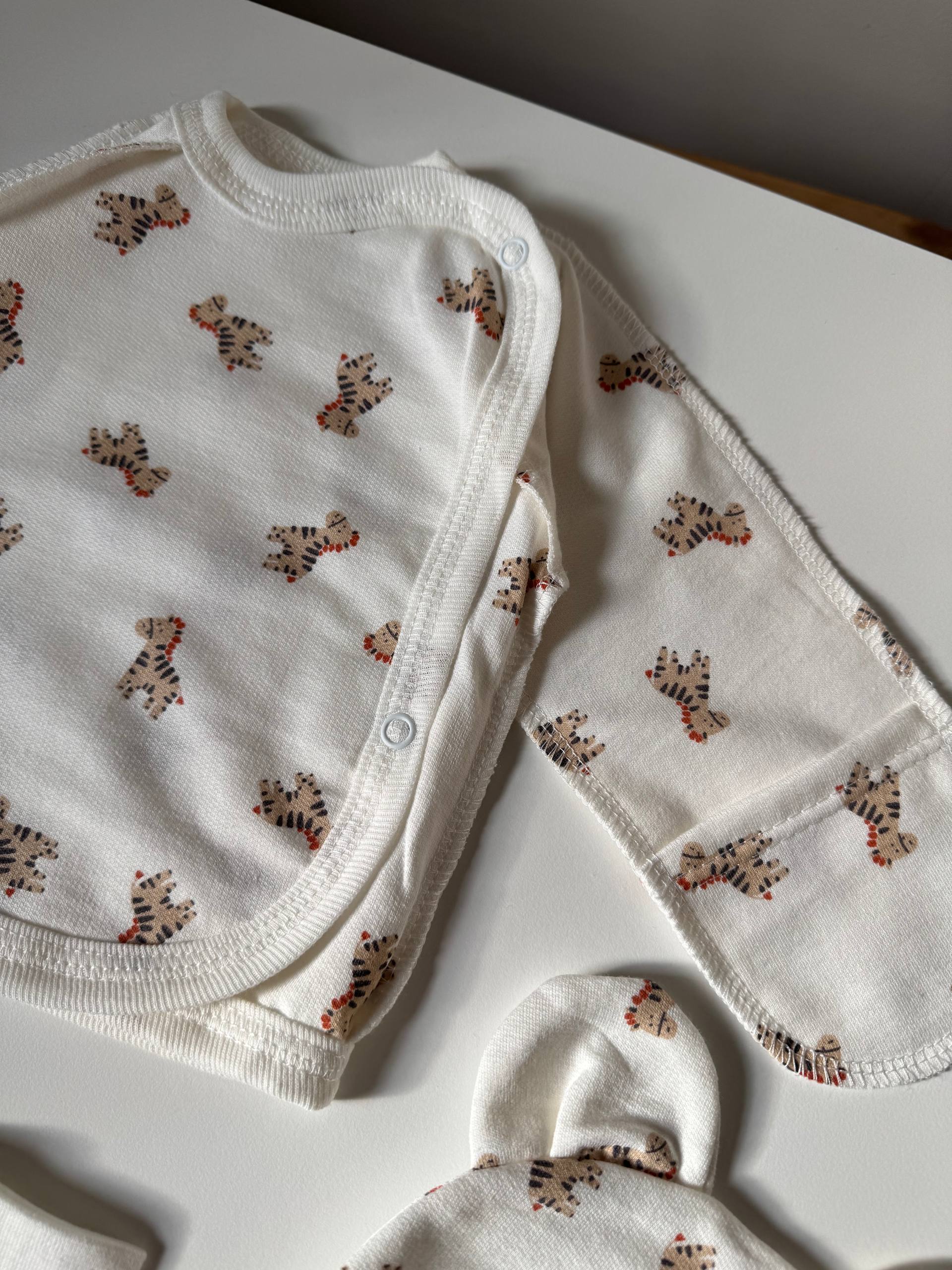 Комплект для немовлят 62–68 із футера — зручний і практичний набір для щоденного використання. У комплект входять сорочка на запах, повзунки із закритими ніжками та шапочка, що забезпечують комфорт і тепло малюку. Одяг для малюків виготовлений із м’якого футера, який приємний до тіла та підходить для чутливої шкіри. Завдяки манжетам-антіцарапкам, зовнішнім швам і зручним кнопкам дитячий комплект гарантує безпеку та комфорт у кожному русі. На вік 3-6 місяців.