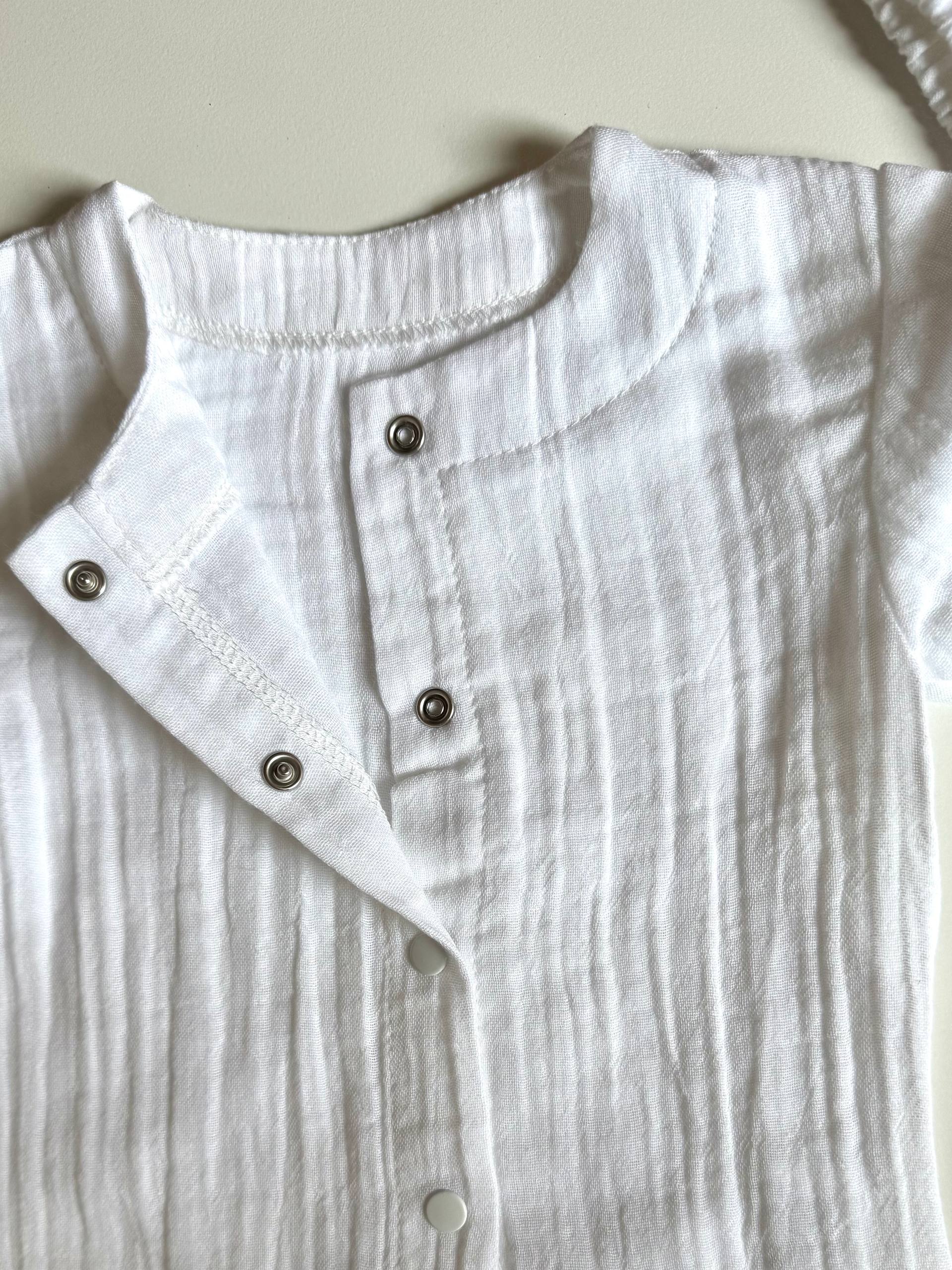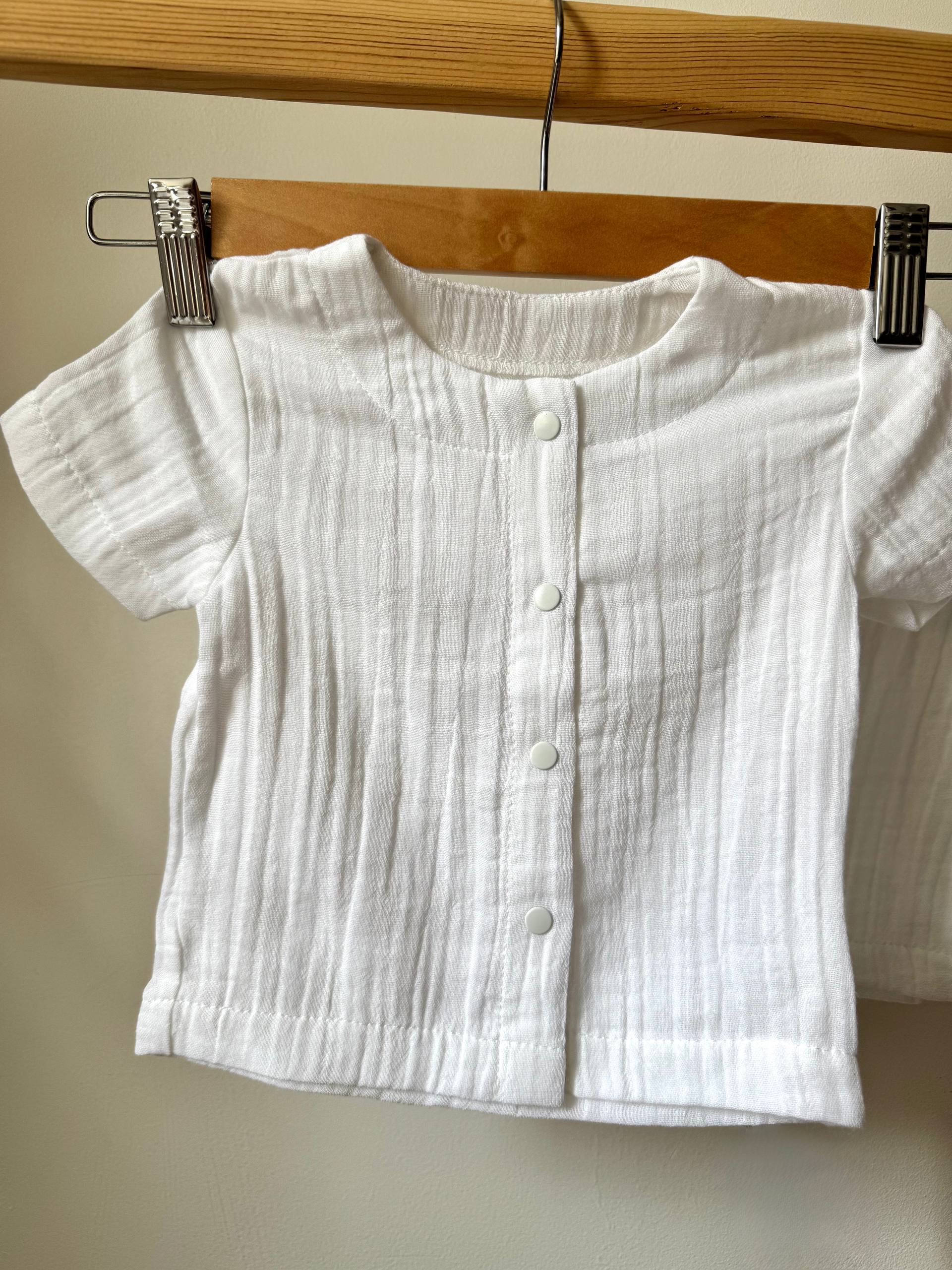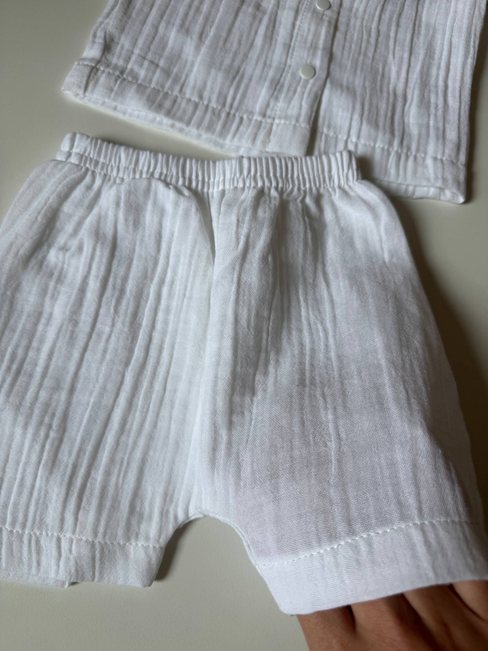 Комплект складається з вільної сорочки з коротким рукавом, що застібається на затишні ґудзики, та легких шортиків на м’якому еластичному поясі. Натуральна жата фактура мусліну не лише виглядає неймовірно стильно, а й стає ще м’якшою з кожним пранням, не потребуючи прасування. Ергономічний крій кожної деталі дарує дитині повну свободу рухів під час ігор на пляжі чи прогулянок у парку. Це втілення природної легкості та витонченого мінімалізму для комфортного літнього дозвілля. Розмір: 68 (3-6 місяців).